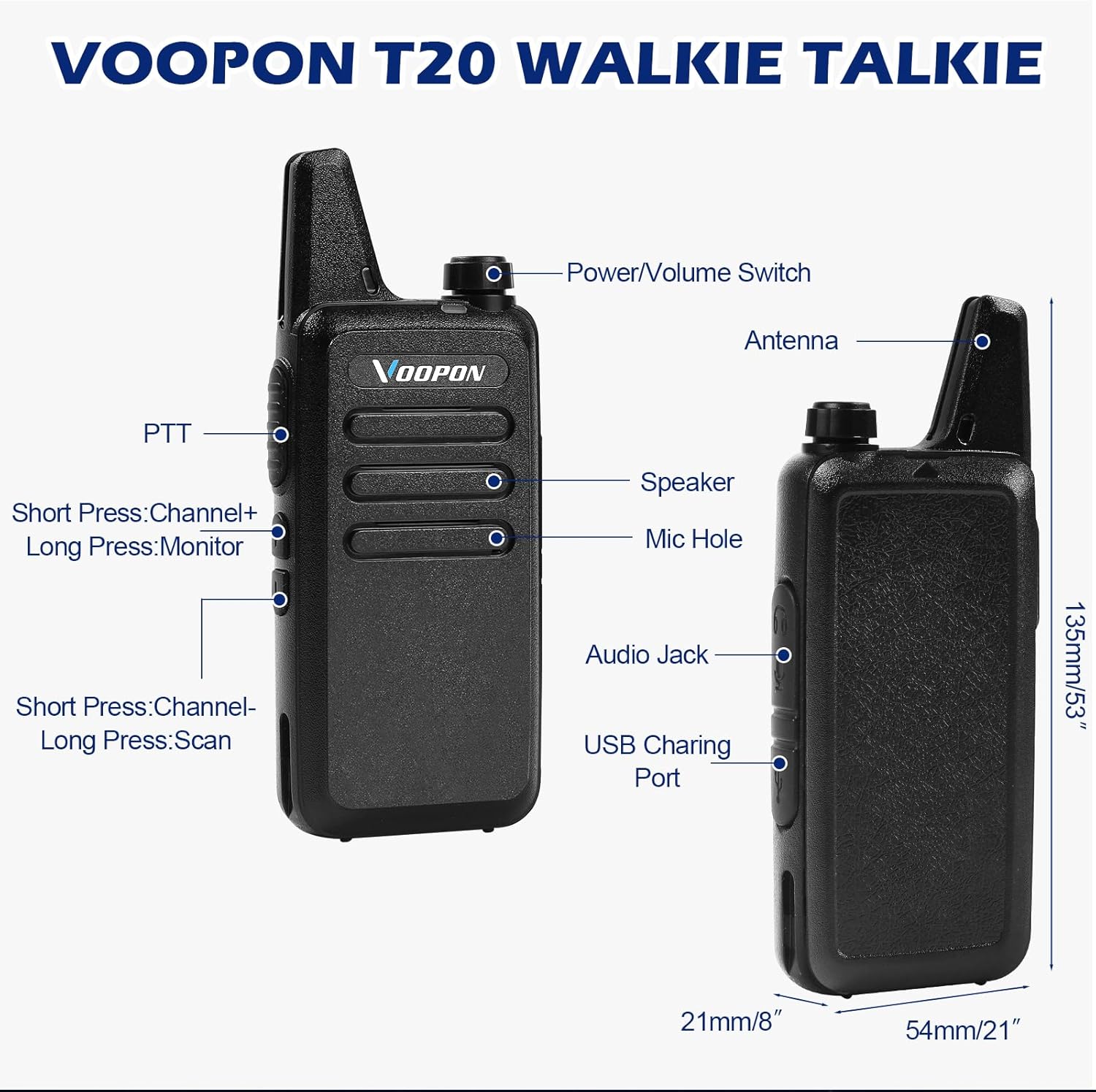 Voopon T20(new 22) walkie talkie has the newest 22 FRS channels, and up to 2W transmission power. The transmission distance is up to 3 kilometers in open areas and 0.5-1 kilometers in towns and cities. Rugged design can resist bad weathers and working conditions. Auto frequency scan can easily find the signal from other radios.