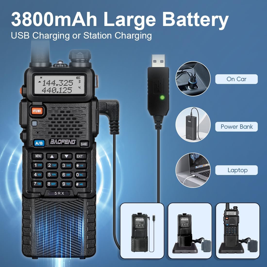 📌【3800mAh Rechargeable】2-Charging Methods -Each Radio equippend with USB Charging Cable and base Charger. 3800mAh Rechargeable Larger Battery, you can easily charge it from power bank、PC、car、wall、laptop and any usb slot and long standby time. The durable battery ensure uninterrupted contact for camping, fishing, hiking or train stations etc