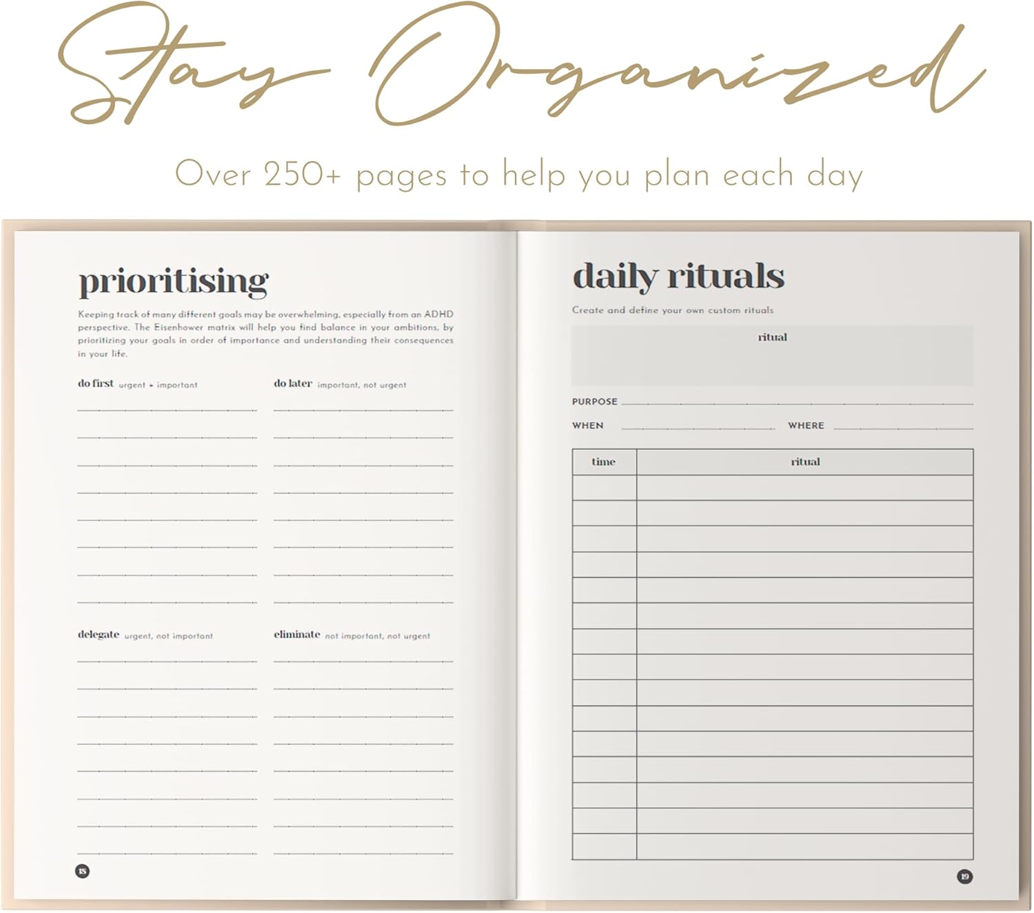 Don’t neglect your well-being! Our self-care planning and journaling pages provide a safe space for reflection, gratitude, and personal growth. These pages are especially helpful for individuals with ADHD who struggle with self-regulation and maintaining a healthy work-life balance. Make self-care a priority with our Focus Planner.