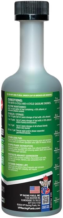 VP Fuel Stabilizer with Ethanol Armor protects your 2 and 4-cycle gas engines and prevents problems due to ethanol-blended pump gasoline. It’s like having an ethanol shield for your engine. You can store your equipment or vehicles with confidence because our stabilizer keeps gas fresh and ensures quick, easy starts. Your vital engine components stay clean and running smooth. In fact, VP Fuel Stabilizer helps you avoid expensive ethanol-related repairs.