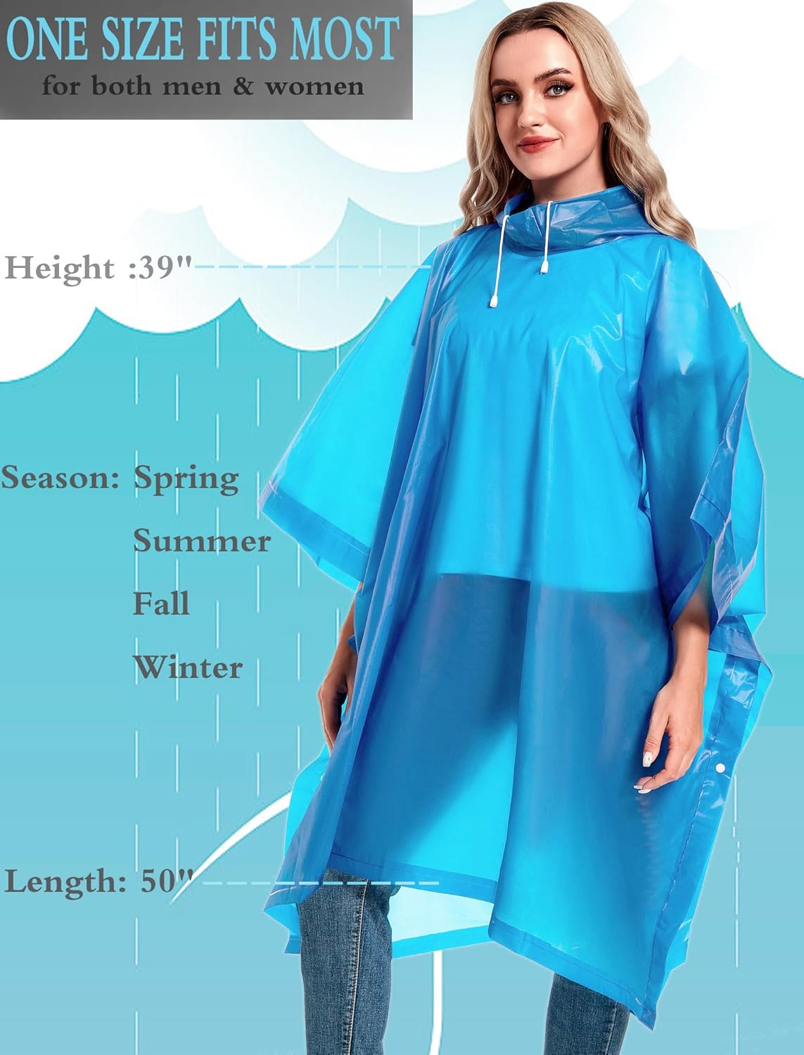 Specifications: Material: EVA Thickness: 0.15mm Weight: 5.1 oz Size: Length: 100cm/39.4 in without hood; Width: 130cm/51.2 inColor:White/ Grey/ Sky Blue/ Yellow/ Pink/ Purple/ Black Suitable for height: 150-190cm/4’11”-6’3” Suitable for weight: 40-90kg/88-198 poundsSeason: Spring | Summer | Fall | WinterPackage: 2x Rain Ponchos