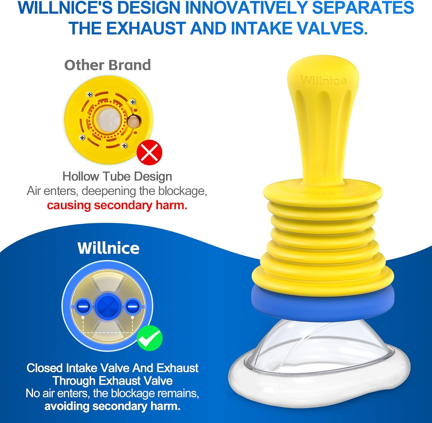 Safer to Use: Willnice adopts patented double-valve design, innovatively separated the exhaust and intake valves, effectively avoiding the risks that can occur with others’ hollow-designed devices that push obstructions deeper when pushed, giving you a safer experience.