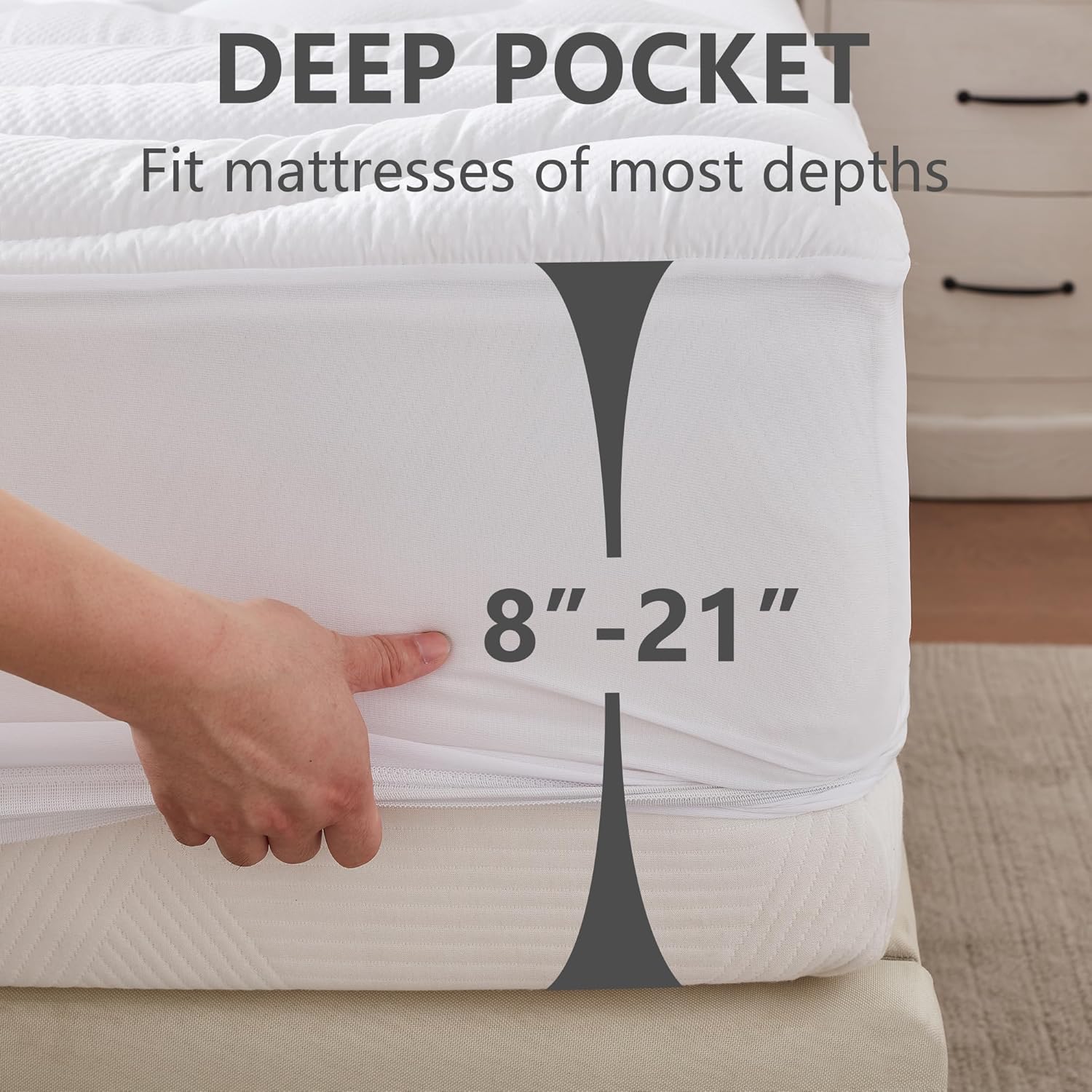 The knitted pocket stretches upto 21 inches and may simply match mattresses of most depths. The pad snugly suits the mattress, no shifting, no noises, guaranteeing you get a deeper and uninterrupted sleep, and its wonderful elasticity makes the wrap simple to suit and take away by one particular person.