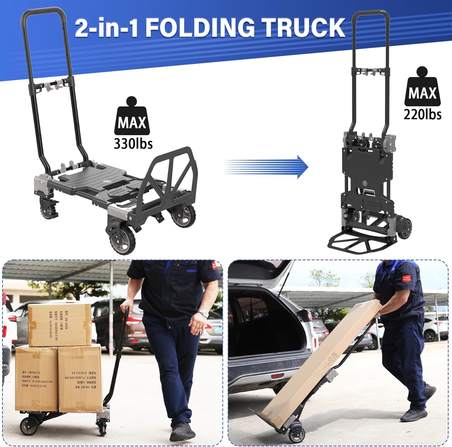 Heavy Duty&Multi-Position: Hand truck dolly foldable made from durable steel frame and bearing capacity of 330 lbs. Hand truck foldable with 5″ and 3.5″dual bearing rubber wheels for maximum stability while in use, create no noise. Folding dolly with 360 degree swivel functionality.