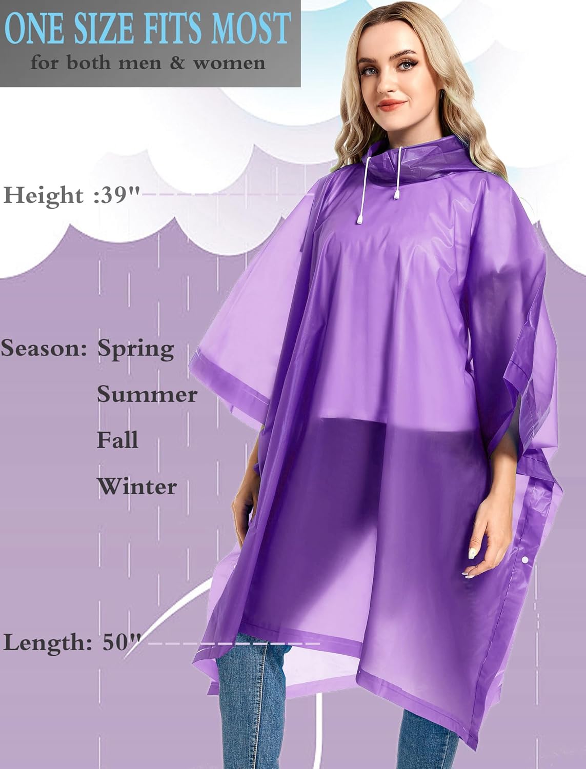 Specifications: Material: EVA Thickness: 0.15mm Weight: 5.1 oz Size: Length: 100cm/39.4 in without hood; Width: 130cm/51.2 inColor:White/ Grey/ Sky Blue/ Yellow/ Pink/ Purple/ Black Suitable for height: 150-190cm/4’11”-6’3” Suitable for weight: 40-90kg/88-198 poundsSeason: Spring | Summer | Fall | WinterPackage: 2x Rain Ponchos