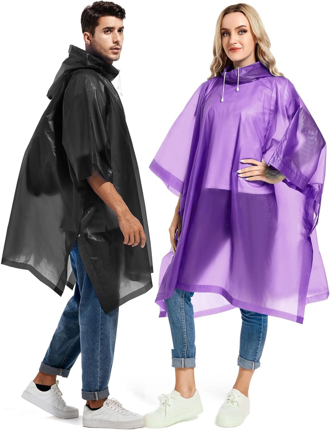 Specifications: Material: EVA Thickness: 0.15mm Weight: 5.1 oz Size: Length: 100cm/39.4 in without hood; Width: 130cm/51.2 inColor:White/ Grey/ Sky Blue/ Yellow/ Pink/ Purple/ Black Suitable for height: 150-190cm/4’11”-6’3” Suitable for weight: 40-90kg/88-198 poundsSeason: Spring | Summer | Fall | WinterPackage: 2x Rain Ponchos