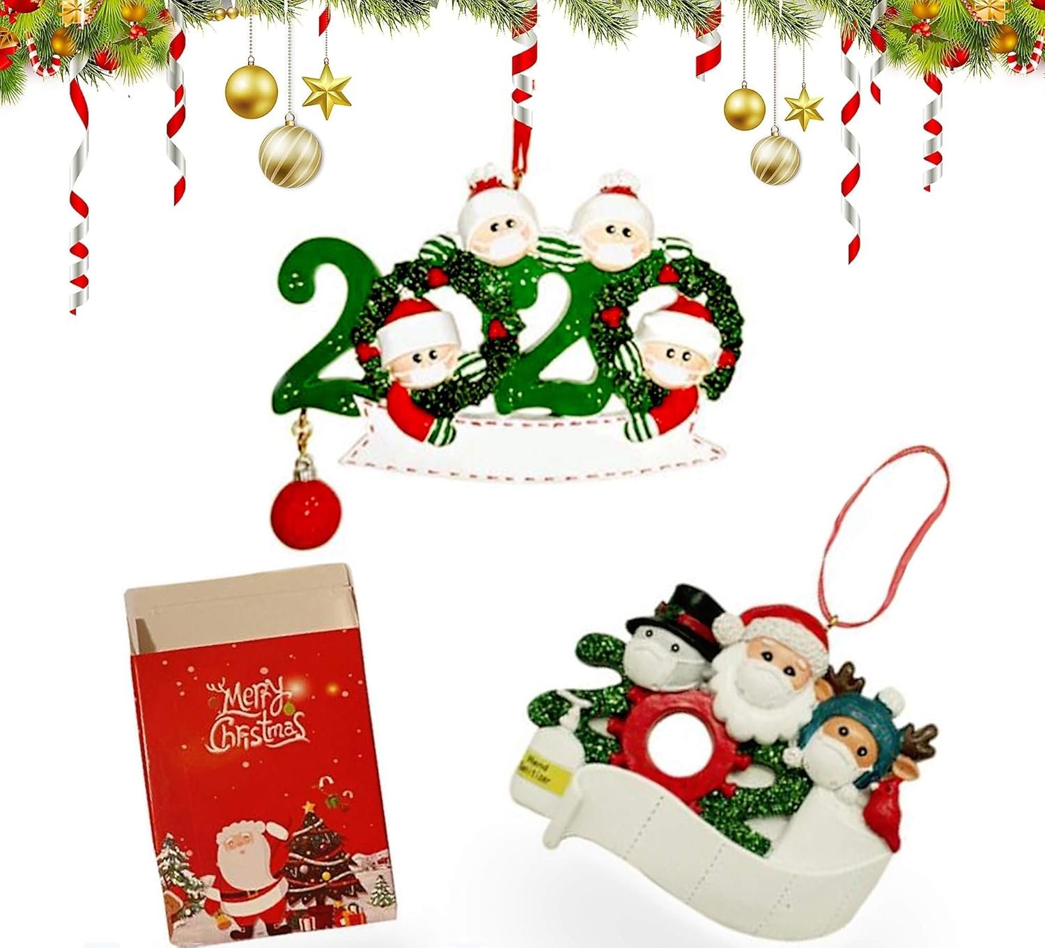 SET OF 2 AND A GIFT BOX INCLUDE: first ornament: Christmas number 2020, 4 members, colorful good quality. Second ornament 3 members, Santa, Snowman and Rudolf. It comes with a gift box for a present. Box is decorated with Santa in the front and Christmas Tree and the other side Santa, Snowman and Rudolph. Both ornaments can be personalized ( pen not included ) ( Fine tip pens and oil pens may be use ) ornaments come with a ribbon loop.