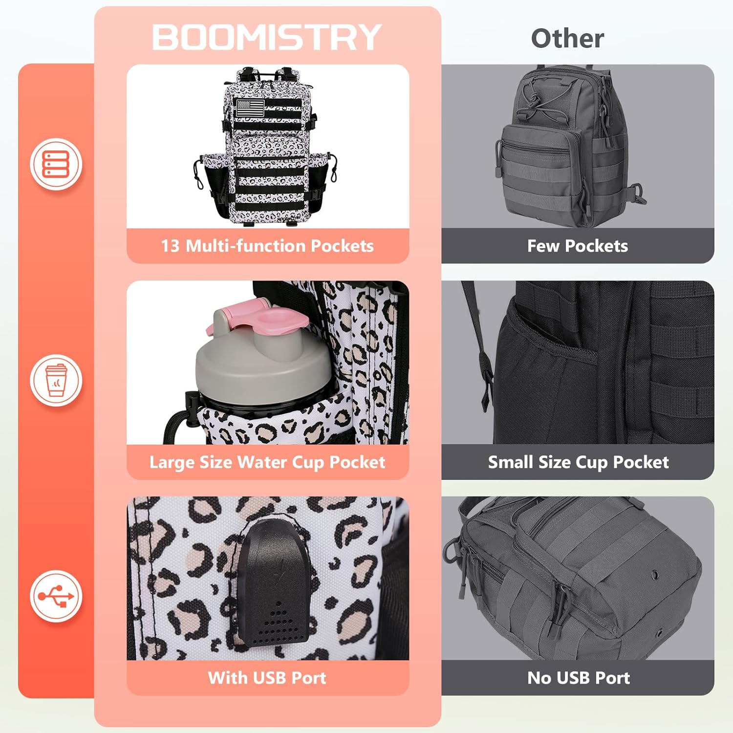 【Portable Tactical Backpack】Boomistry tactical backpack sets a new standard for versatility. Size: 10.2 x 9.6 x 17.7 inches, 25-liter capacity, it offers a spacious yet compact design. Crafted from robust 900D waterproof Oxford fabric and secured with KAM zippers, Ideal for a wide range of activities, from hitting the gym to setting up camp in the wild, this backpack combines the ultimate in functionality with unmatched comfort