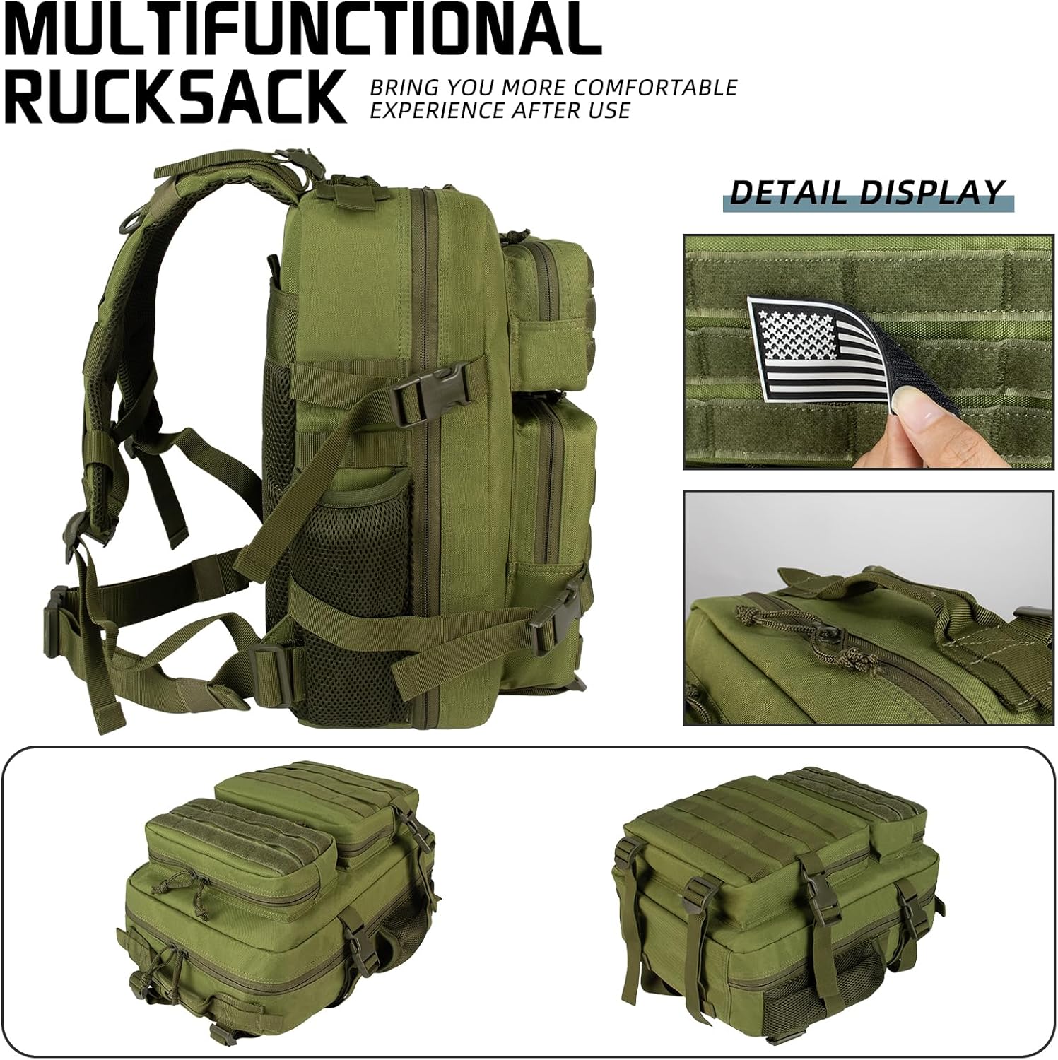 【Durable and Water resistant】This military backpack is made of 900D water repellent fabric with a smooth scratch-resistant zipper. At the same time, the reverse zipper design can reduce water flow into the bag. Double stitching at the interface, tear resistant. The 180-degree flat-open design makes packing and accessing items easy, while the backpack comes with a large area of Velcro and a removable US flag patch for personalized customization.
