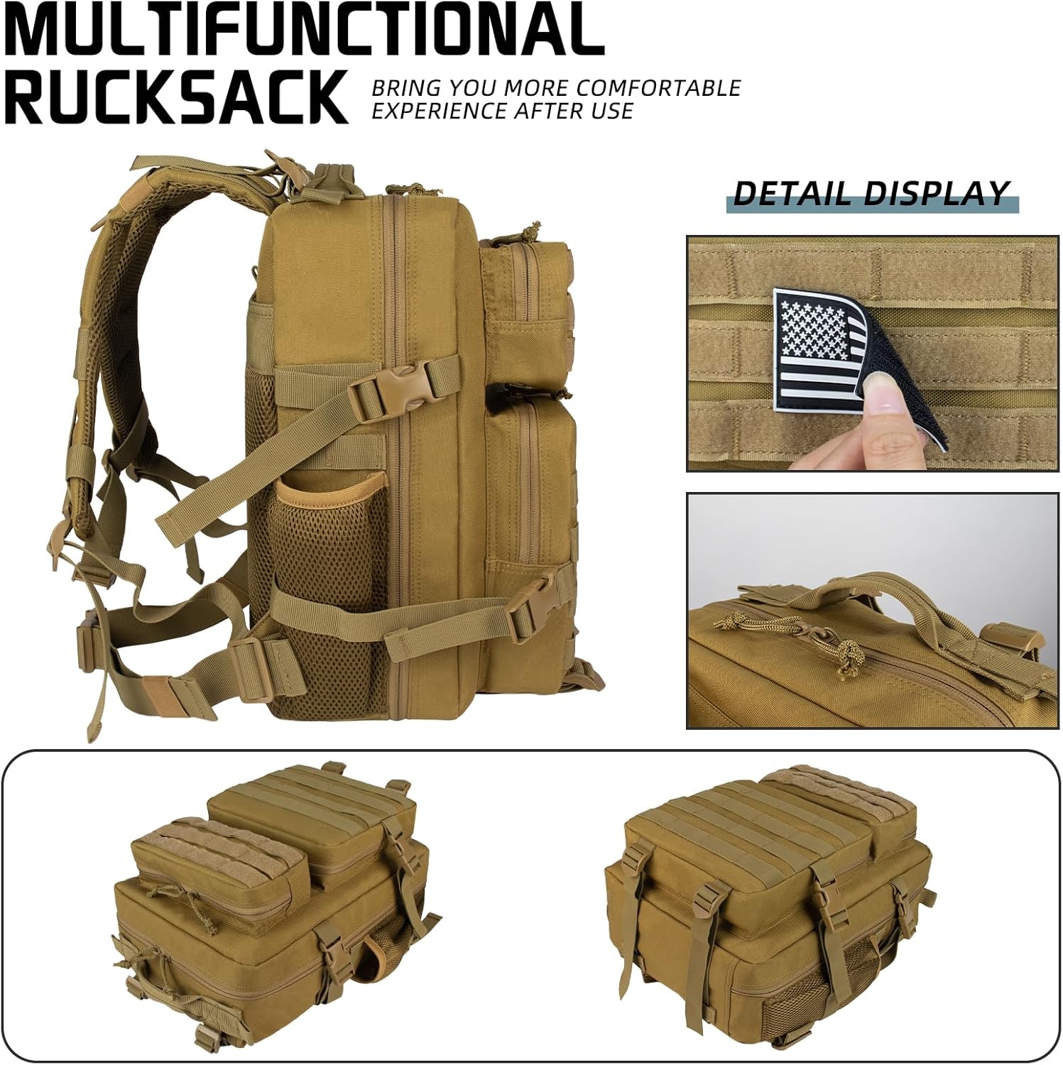 【Durable and Water resistant】This military backpack is made of 900D water repellent fabric with a smooth scratch-resistant zipper. At the same time, the reverse zipper design can reduce water flow into the bag. Double stitching at the interface, tear resistant. The 180-degree flat-open design makes packing and accessing items easy, while the backpack comes with a large area of Velcro and a removable US flag patch for personalized customization.