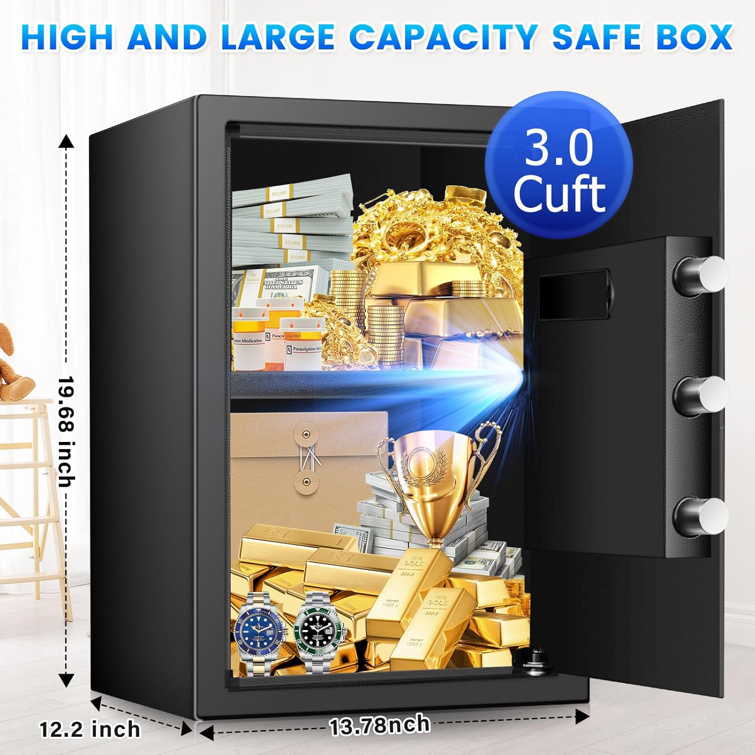 【LARGE HOME SAFE BOX & FIREPROOF BAG】This home safe box has a large size of 19.68″ x 13.78″ x 12.2″ . Extra-large interior space allows you to hold almost any valuables, perfect for storing firearms, thousands of ammo, A4 documents, laptops, jewelry, medicines, cash, and more. The combination of a digital safe and fireproof bag can protect your valuables from fire, hurricanes, and earthquakes. Provide the strongest protection for your property security.