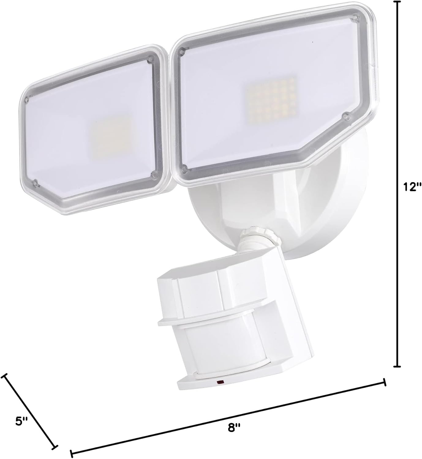 Energy Star Certified: Very bright LED light at 4000 Lumens output by two energy saving light heads, 40 watts in total. Provides excellent lighting for the exterior of your home while saving money on energy costs.Powerful PIR Sensor: High tech 180 degree motion detection with up to 70 ft. range. The broad detection range provides peace of mind for you and your family and provides wide coverage and security. Integrated photocell for automatic dusk-to-dawn operation. Manual override of motion sensor with adjustable run time 1/5/10 minutes.Easy Installation and Highly Adjustable: Its single screw easy mounting method on either on walls or eaves, provides a simple mounting option. Swivel arm design allows easy adjustment of light direction; Motion sensor direction adjustable with three operation modes: Test/Auto/Manual