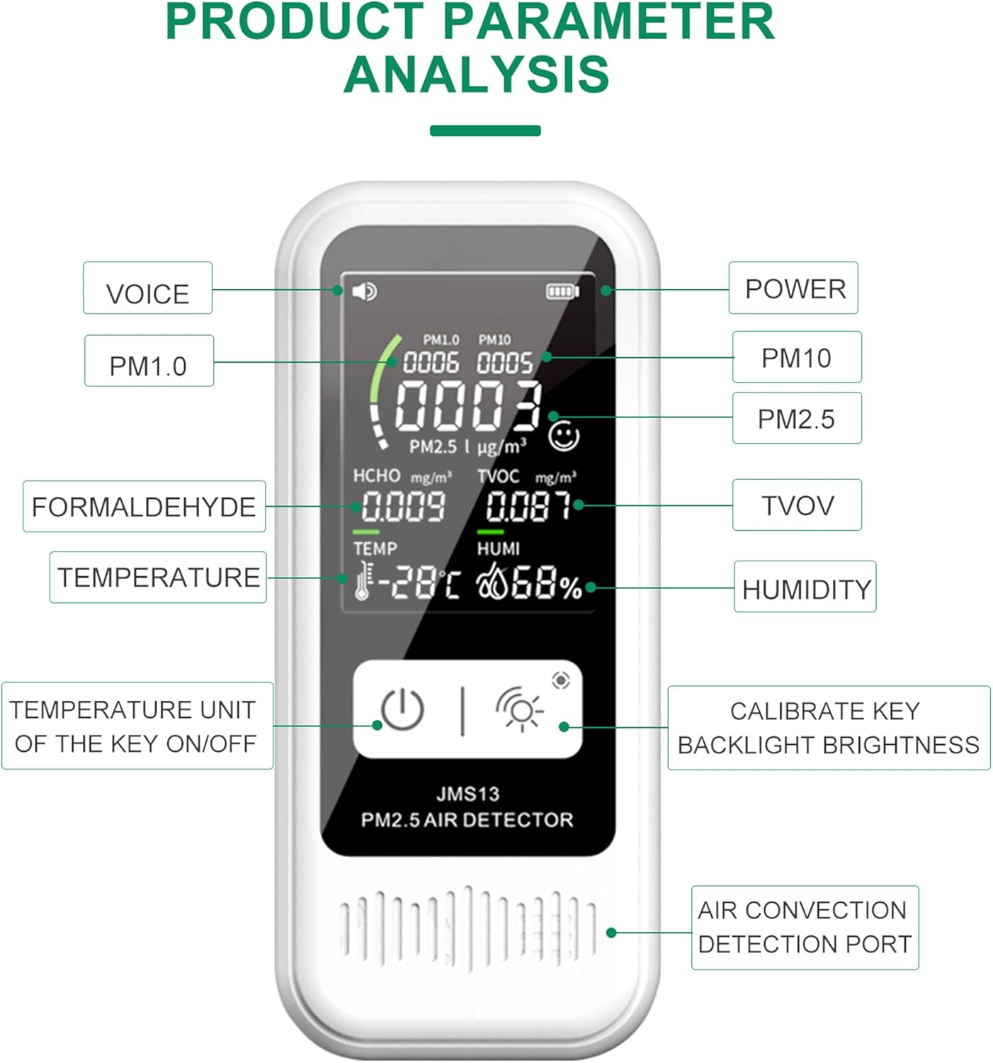 【Advanced Detection Technology】:The PM2.5, PM1.0, and PM10 detection modules utilize the Mie scattering principle, delivering high-precision particulate matter readings. For TVOC and HCHO, the device employs a semiconductor gas sensor, ensuring accurate detection of harmful gases and chemical pollutants.