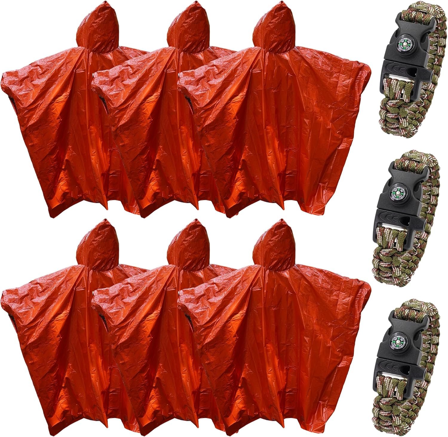 A very practical set combination consisting of 6 pcs emergency rain ponchos and 3 pcs 3in1 emergency survival bracelets, which can reflect 90% of body heat and effectively maintain body temperature in low temperatures. The emergency cloak is bright orange, with strong reflection of light, making it very easy to be detected when waiting for rescue in emergency situations.