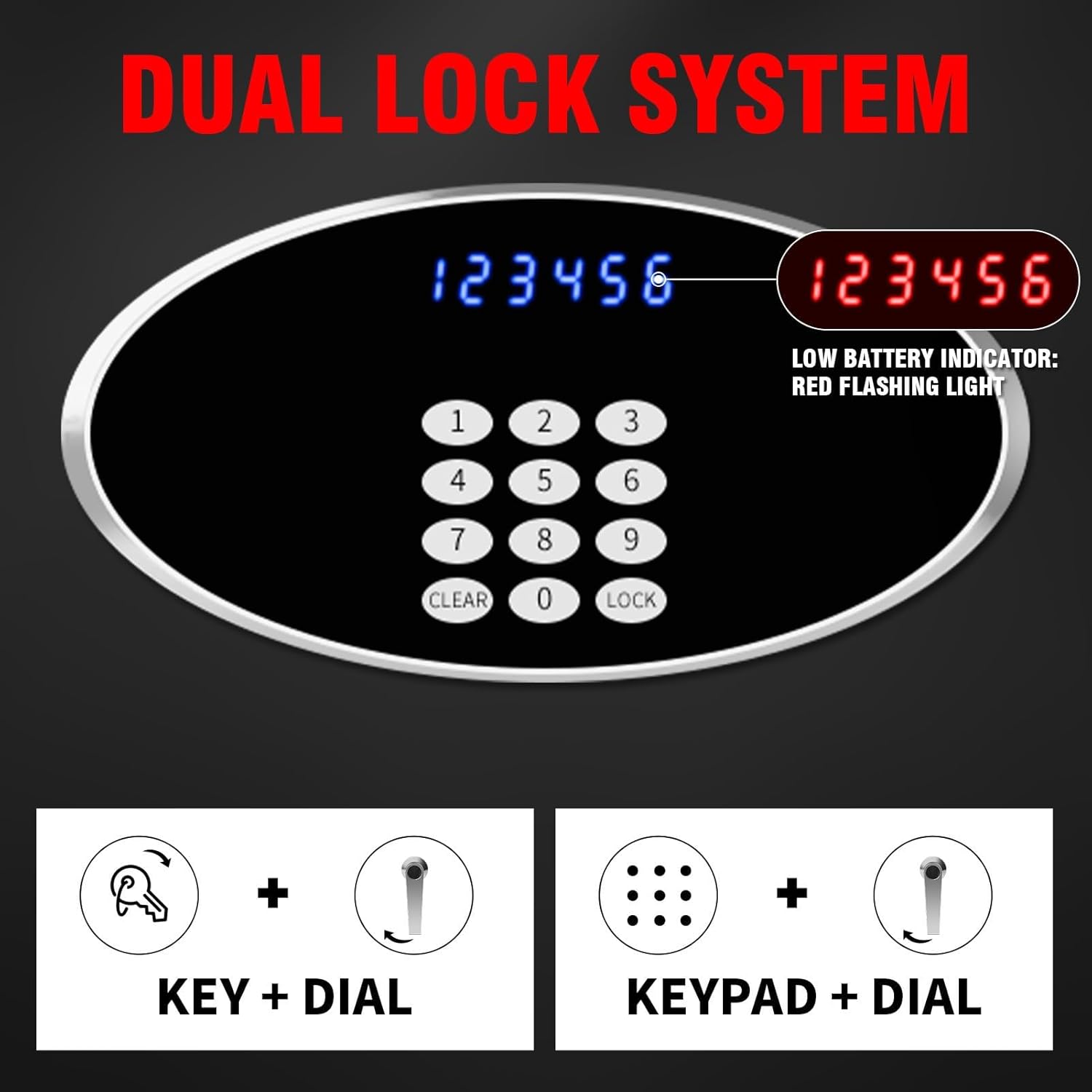 🔥【LCD SCREEN COMBINATION LOCK STEEL SAFETY BOX】Our heavy duty home safe box is equipped with a visual display and electronic keypad lock and key lock. Showing your input as you type in your security code. It supports the deletion of incorrect passwords, It also features a password-hiding function to prevent others from seeing your password. This cabinet safe is perfect for securing items AWAY FROM KIDS, THIEVES, AND PEOPLE YOU DON’T TRUST.