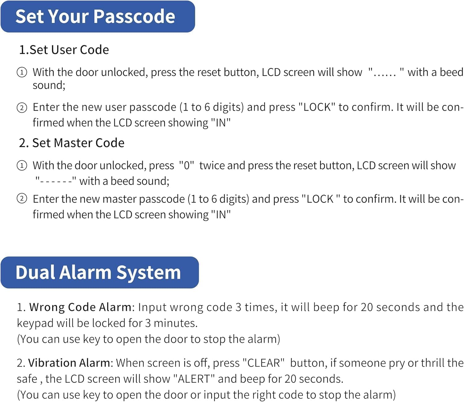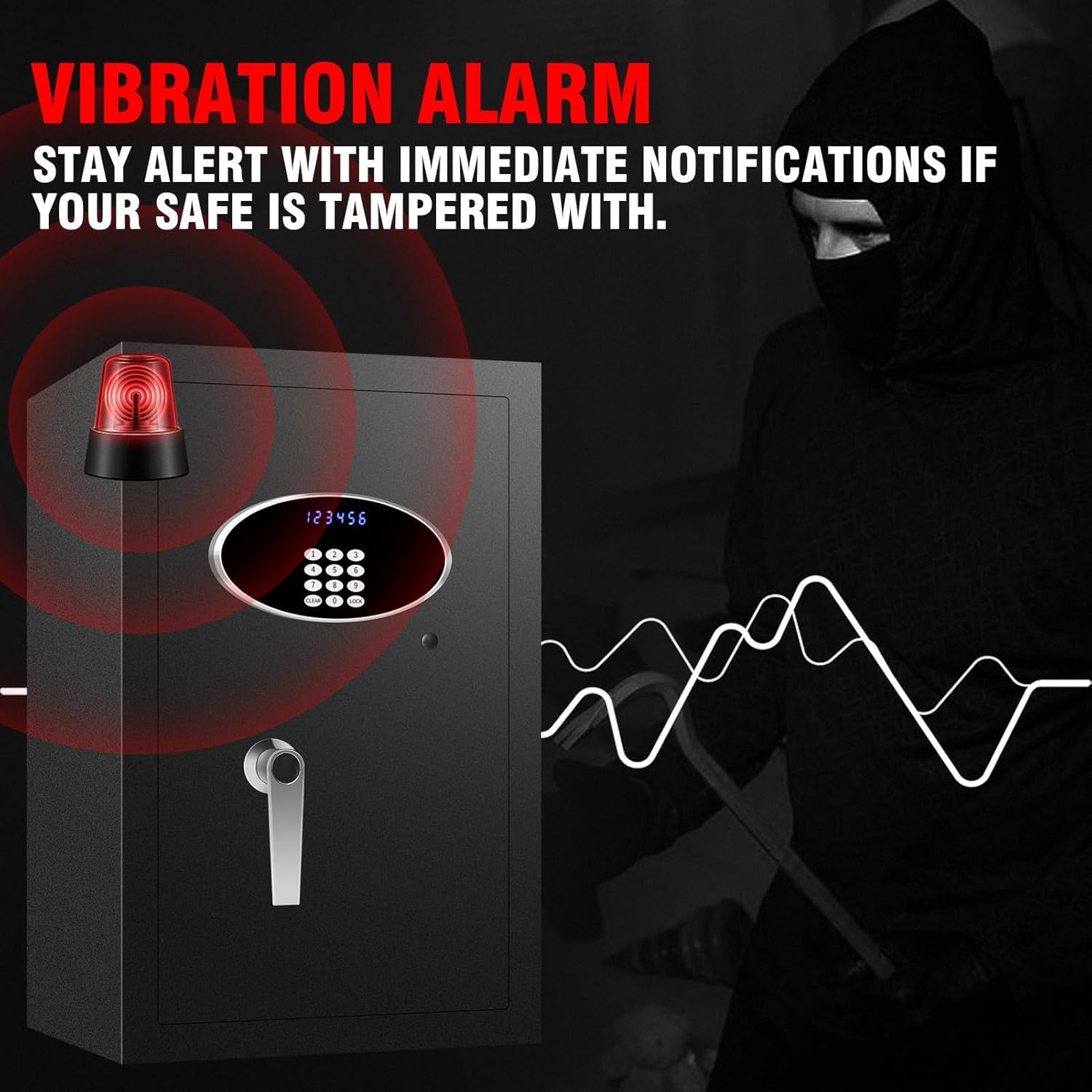 ⏰【SMART WARNING ALARM SYSTEM】All illegal access is denied! Our BIG safe provides an automatic lock and automatic warning security system: Tamper and motion-sensitive alarm. A security alarm will be triggered for 20 seconds if the passcode is entered incorrectly 3 times or if the safe is shaken violently.