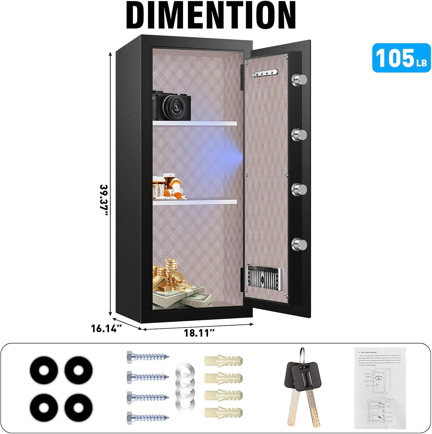 🗄️【LARGE ADJUSTABLE CAPACITY SAFE】 Extra large fire proof safe for home can protect almost all valuable assets and belongings, such as medication, laptops, gold bars, money, mail, check payment, files, hand guns, pistols, documents, birth certificates, and social security cards. Designed with removable shelves, this cabinet safe can accept multiple sizes of valuables. PERFECT FOR HOME, HOTEL, BUSINESS AND OFFICE.