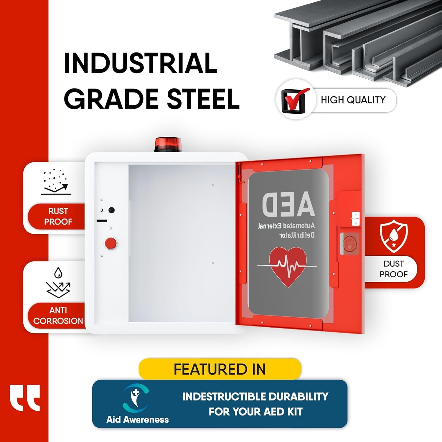 ROBUST AND DURABLE DESIGN – Constructed from Industrial Grade metal, ResQRed’s AED cabinet offers unmatched durability and protection for your AED defibrillator. The sturdy metal storage cabinet ensures longevity and reliability in any environment, keeping your AED and first aid kit safe and secure.