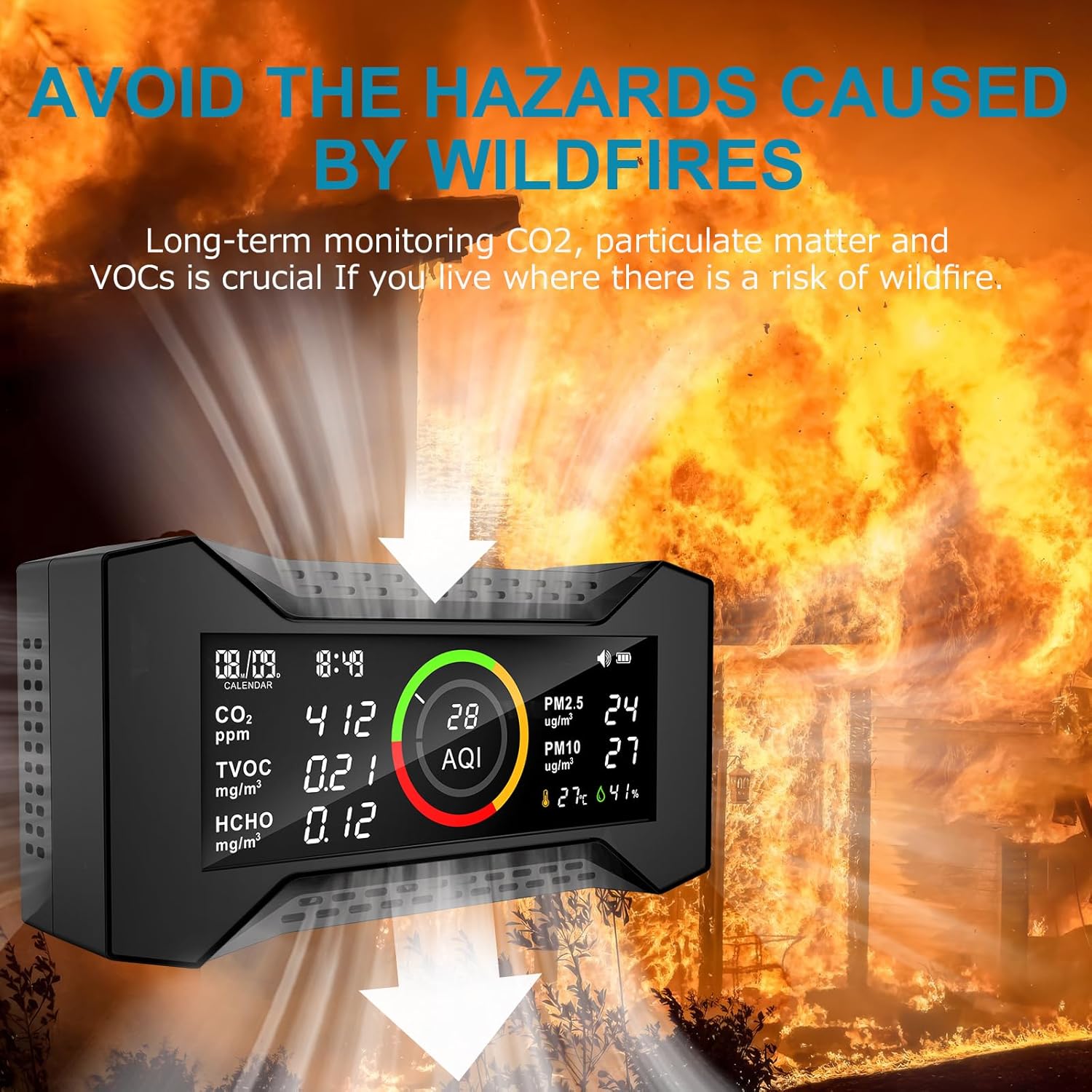 Preventing Damage Caused By Wildfire: Long-term monitoring CO2, particulate matter and VOCs is crucial If you live where there is a risk of wildfire. By measuring particulate pollution, an air quality tester can help you know when to change your home’s air filter or open window.