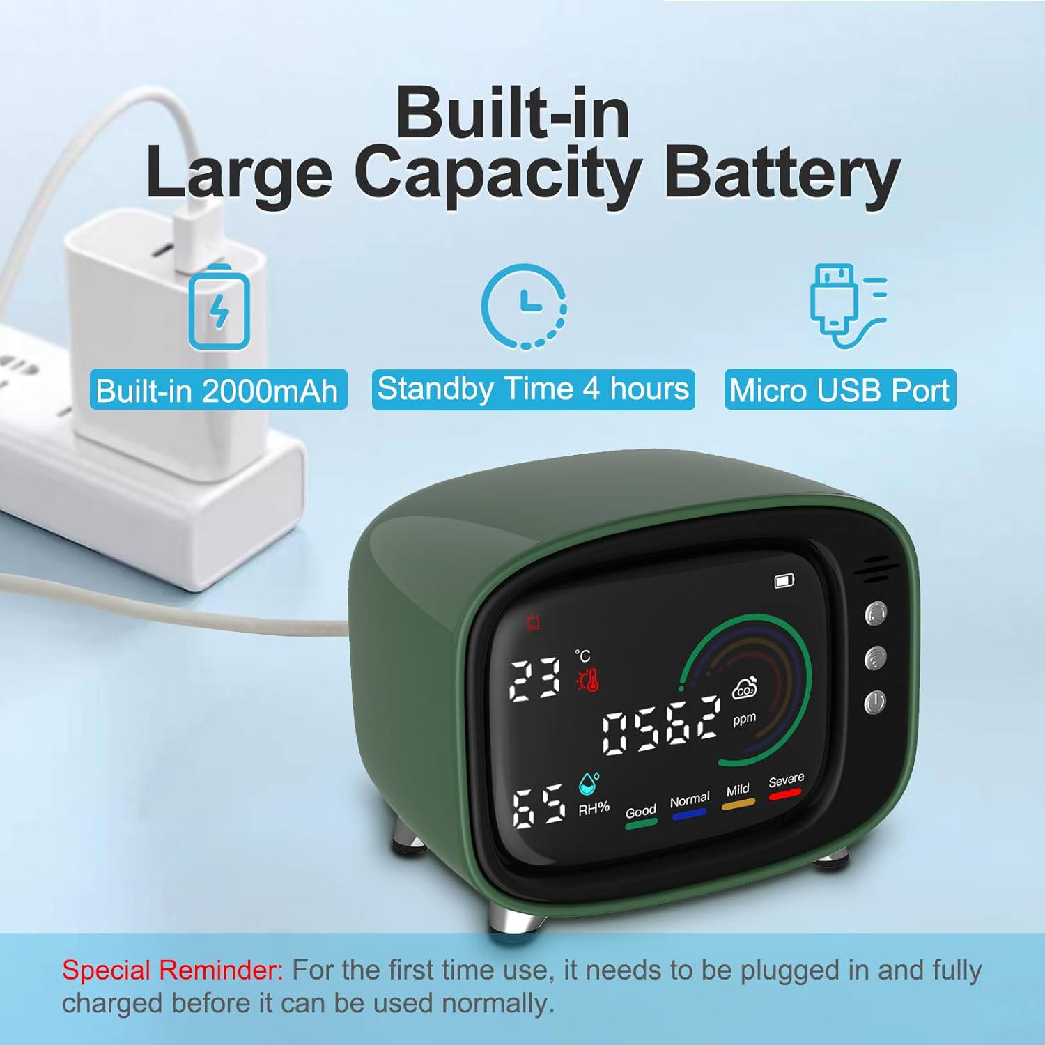 【Friendly reminder & Safety Principles】For indoor air quality monitoring, the IAQ detector needs to be preheated after turning on. After about 5 minutes, the accuraty air quality will gradually be detected. If the air circulation is good, the detection will be faster and more accurate. For example, when the detector is moved from one room to another, the AQI data detected will not immediately change,If the air quality is poor, in order to ensure good health, it is recommended to open windows for ventilation immediately before testing.Notes: Before May Day 2025,The IAQ monitors Only support Celsius degrees, Do Not Support Fahrenheit degrees.