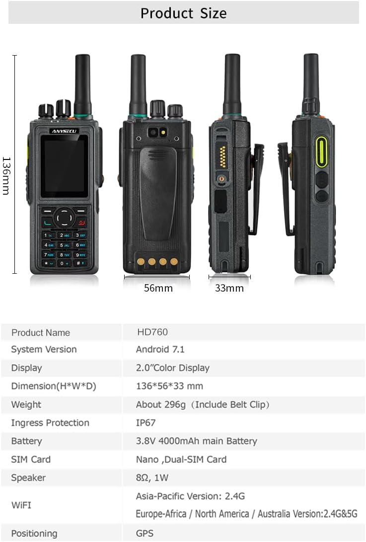 ANYSECU Zello 4G Network Radio HD760 Android 7.1 LTE/WCDMA IP67 Waterproof Mobile Phone Work with Real-ptt