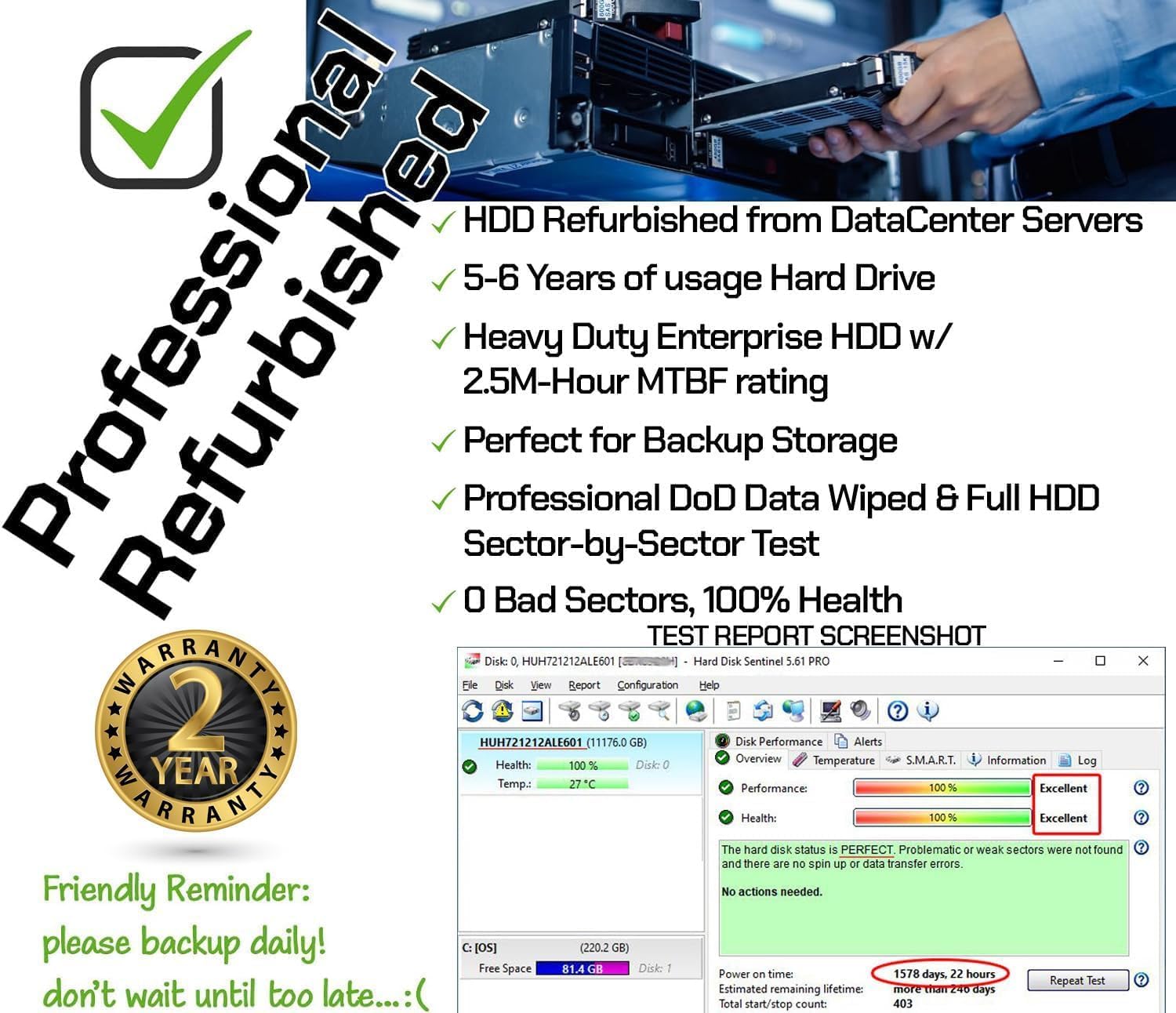 NOTE: These internal enterprise HGST HDD is used by Datacenter Servers for about 5 Years period. HDD was refurbished and data wiped with DoD standard. It’s fully tested & passed HGST factory diagnose software test. Since this is heavy duty enterprise HDD with a 2.5M-hour MTBF rating.