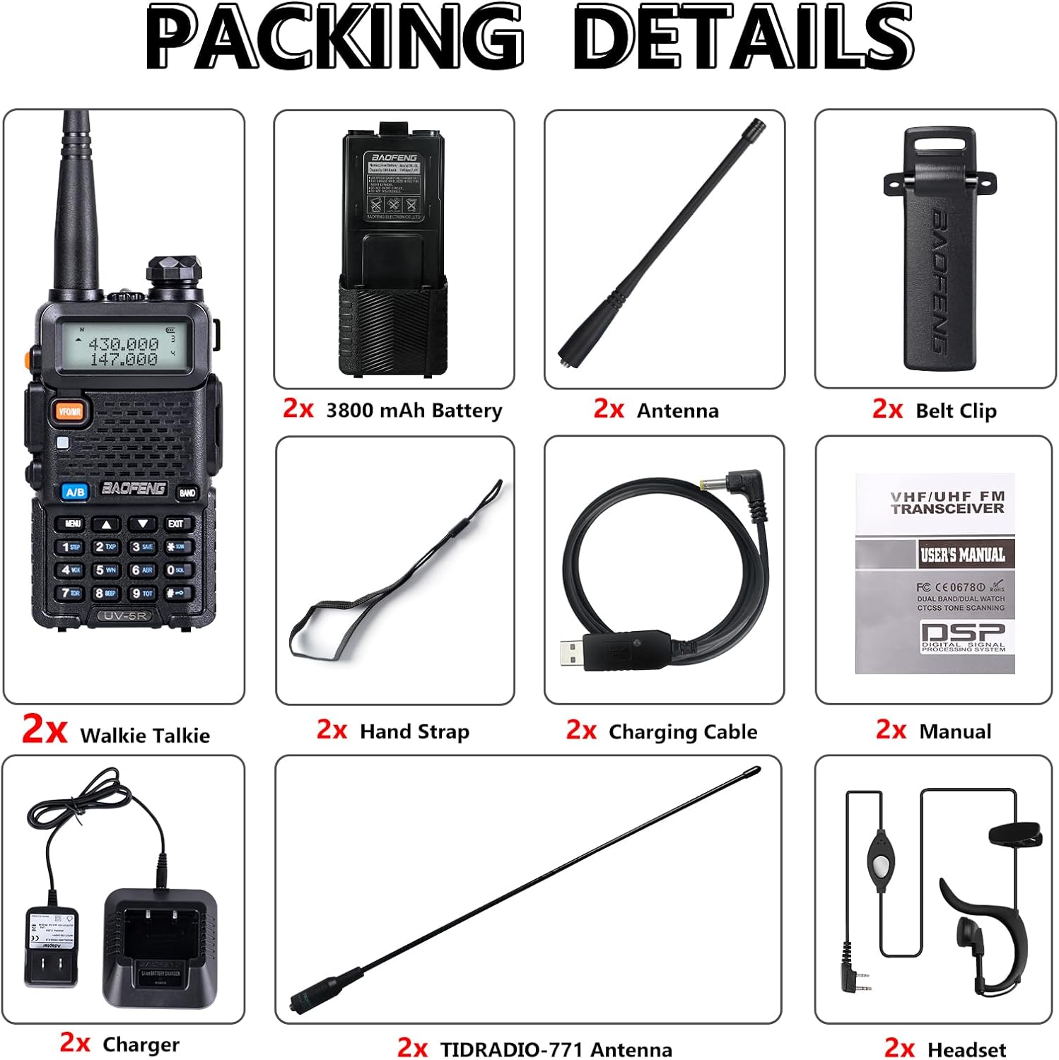 All you need is in a one box! This great value classic UV5R set included 2pcs 3800mAh Batteries, 2pcs Earpieces(clear sound quality, Privacy Protection). 2pcs 𝐓𝐃-𝟕𝟕𝟏 Longer Antenna(Extend 30% talk range than the normal antenna), 2pcs Charge Cradle, 2pcs hand straps, AND 2pcs USB Charging Cable.𝐒𝐮𝐩𝐩𝐨𝐫𝐭𝐬 𝐊𝐞𝐲𝐛𝐨𝐚𝐫𝐝, 𝐏𝐂 𝐚𝐧𝐝 𝐂𝐇𝐈𝐑𝐏 𝐩𝐫𝐨𝐠𝐫𝐚𝐦𝐦𝐢𝐧𝐠.