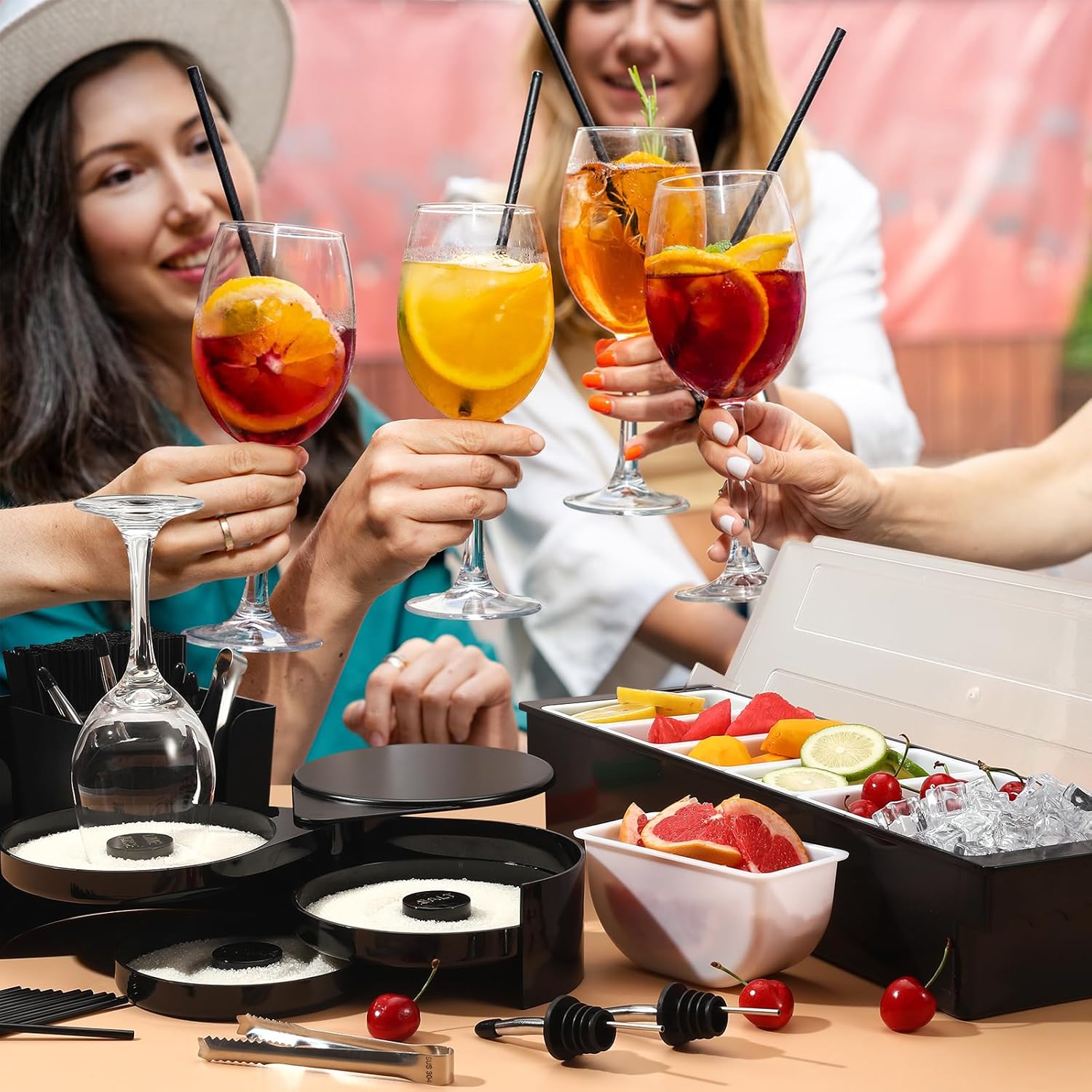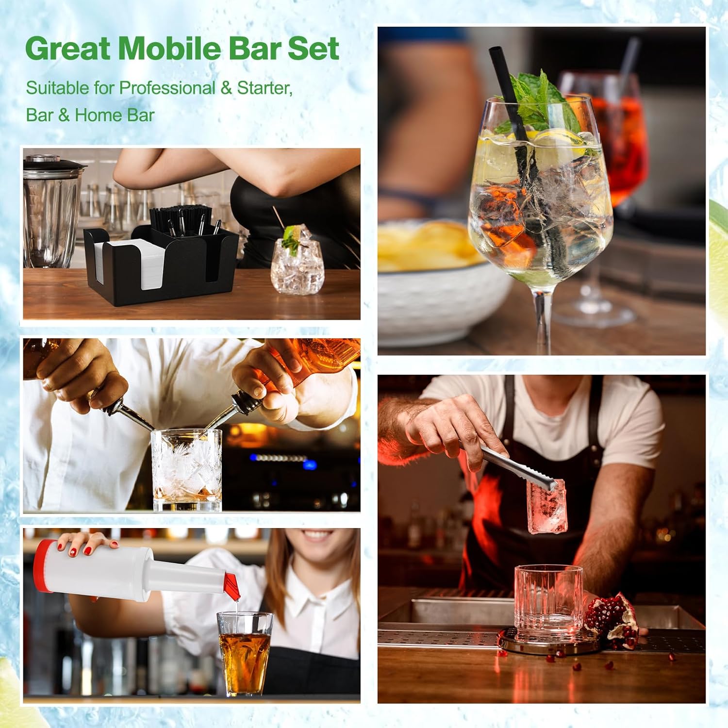 【All-In-One Mobile Bar Set】- 1 pcs: bar mat, bar glass rimmer, bar caddy, bar fruit caddy with lid; 2 pcs: juice pour bottles; 3 pcs: mini serving tongs; 12 pcs: liquor bottle pourers; 1 bags of cocktail stirrers. This set has what you need for party or outdoor get together–basically all of the necessaries for equipping a bar