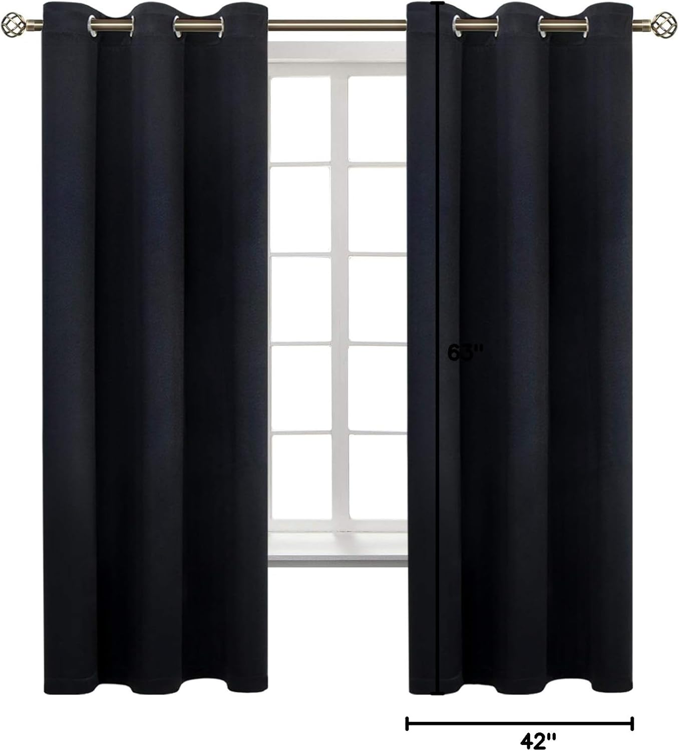 Package Includes: Set of 2 black blackout curtains; Each panel measures 42 Inch wide by 63 Inch long.