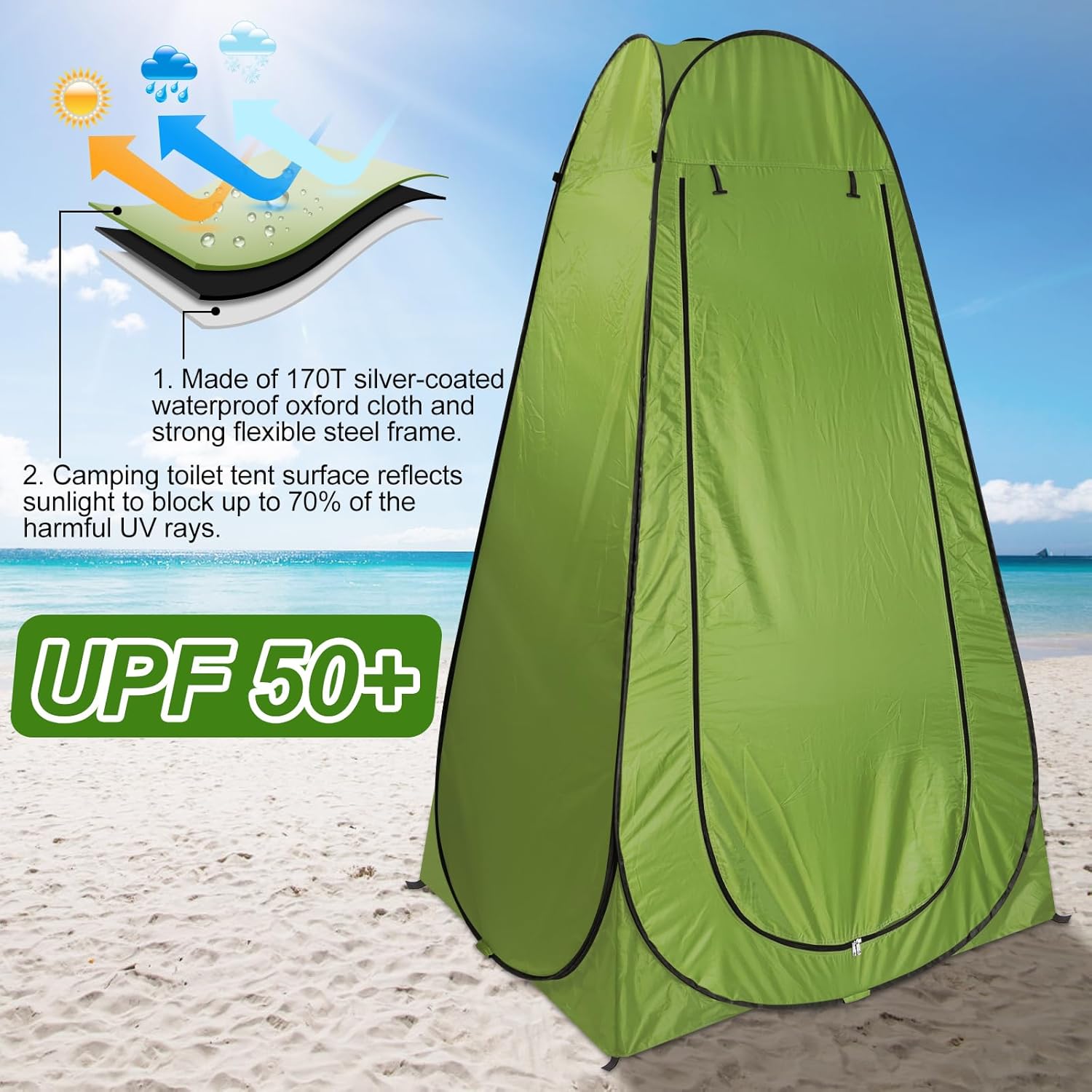 【UPF 50+ & Good Ventilation】Pop up privacy shower tent is made of 170T silver-coated waterproof oxford cloth and strong flexible steel frame for premium durability, it is not easy to break. Camping portable potty tent surface reflects sunlight to block up to 70% of the harmful UV rays. Zipper window with large entrance deliver 360-degree ventilation for better dissipation of body heat and odor.