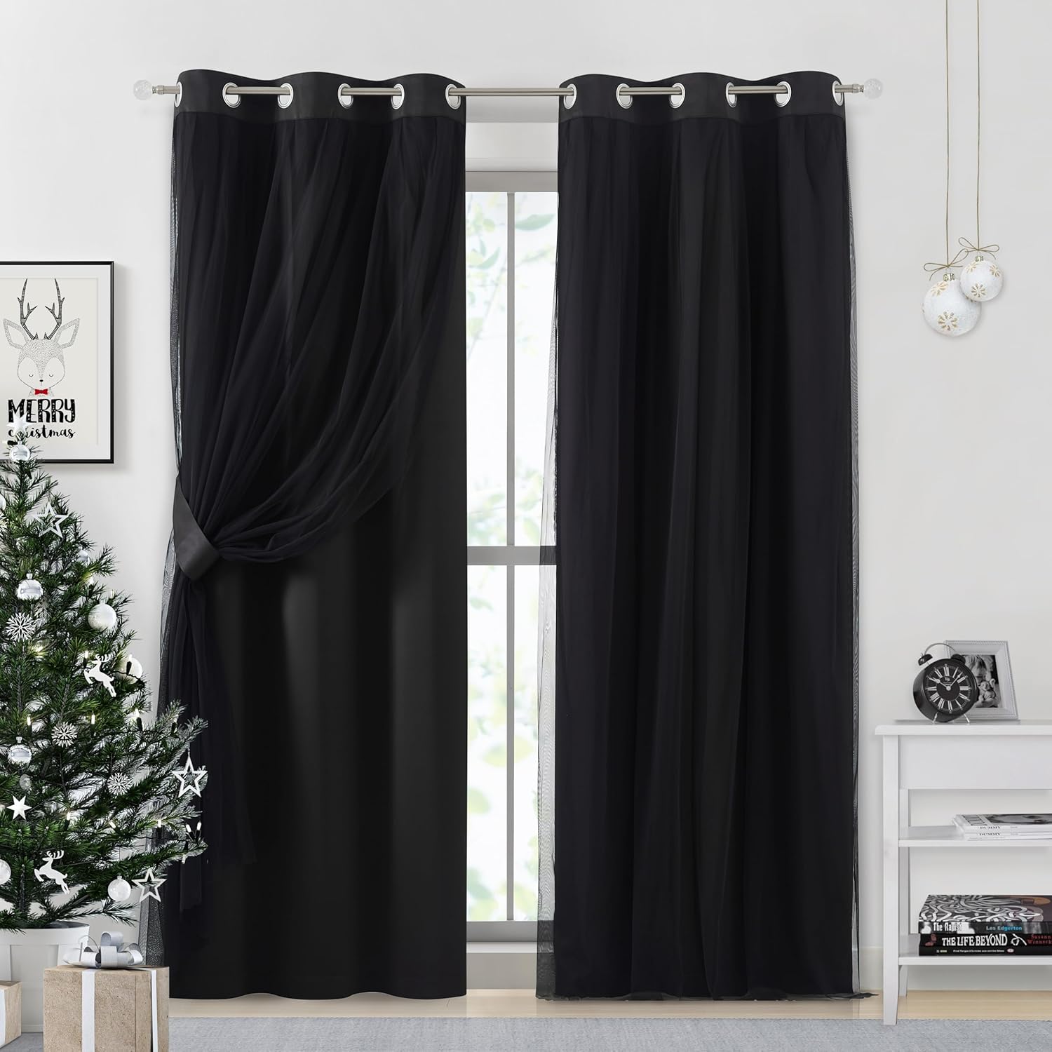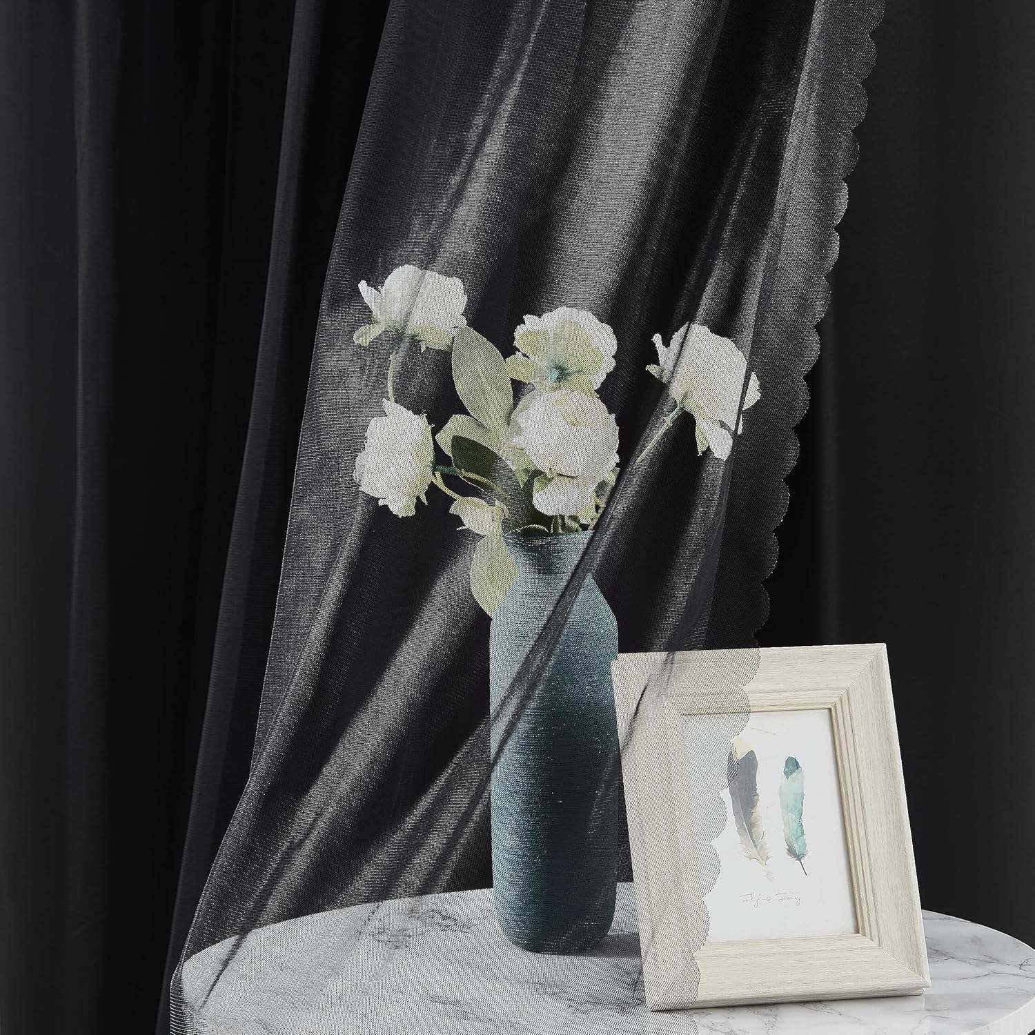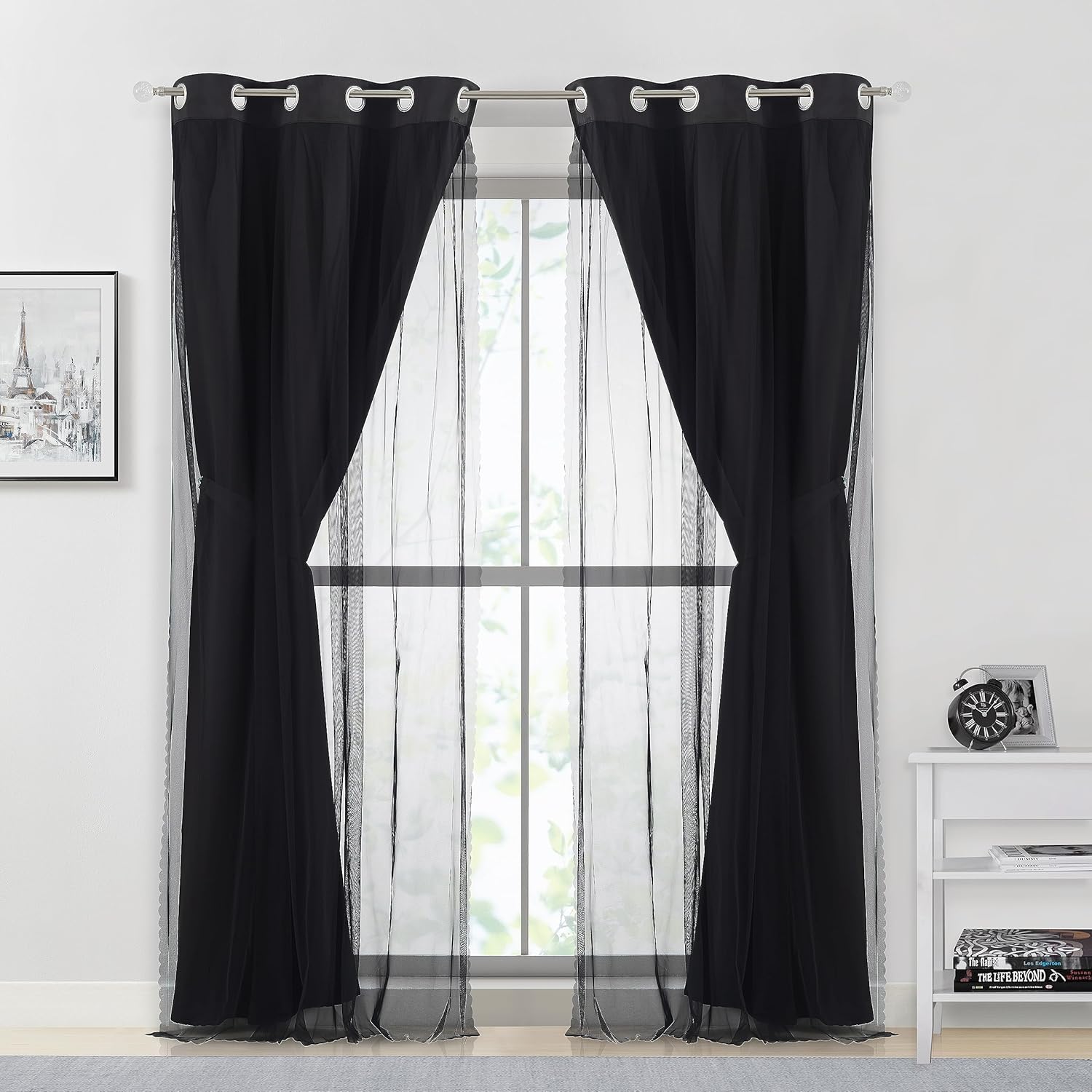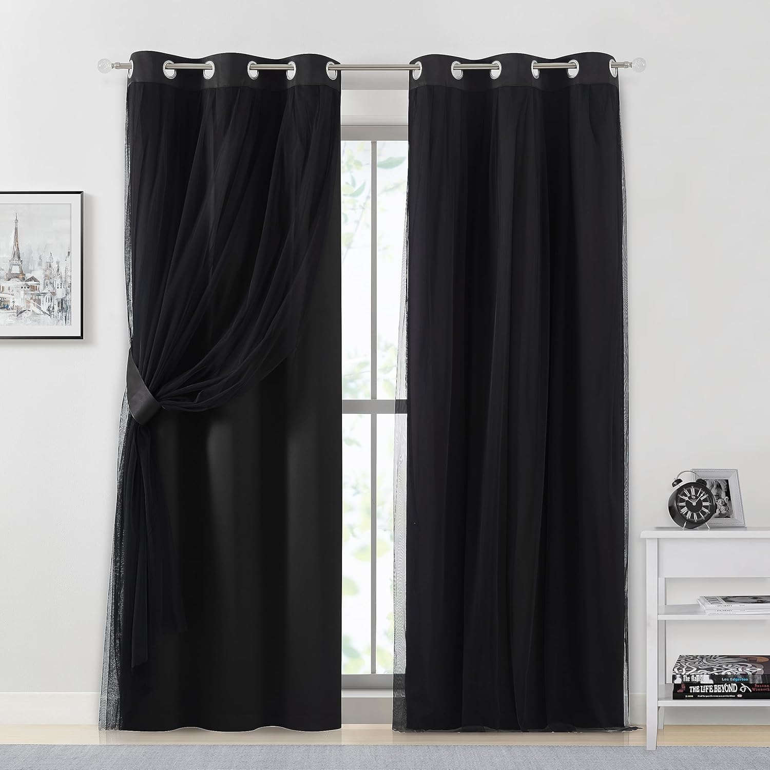 Functional & Modern:Black blackout curtains paired with sewn-in black sheers achieve the layered sophistication,bringing romantic atmosphere to any home style,like living room,bedroom,kitchen,office,nursery,girls room,etc.