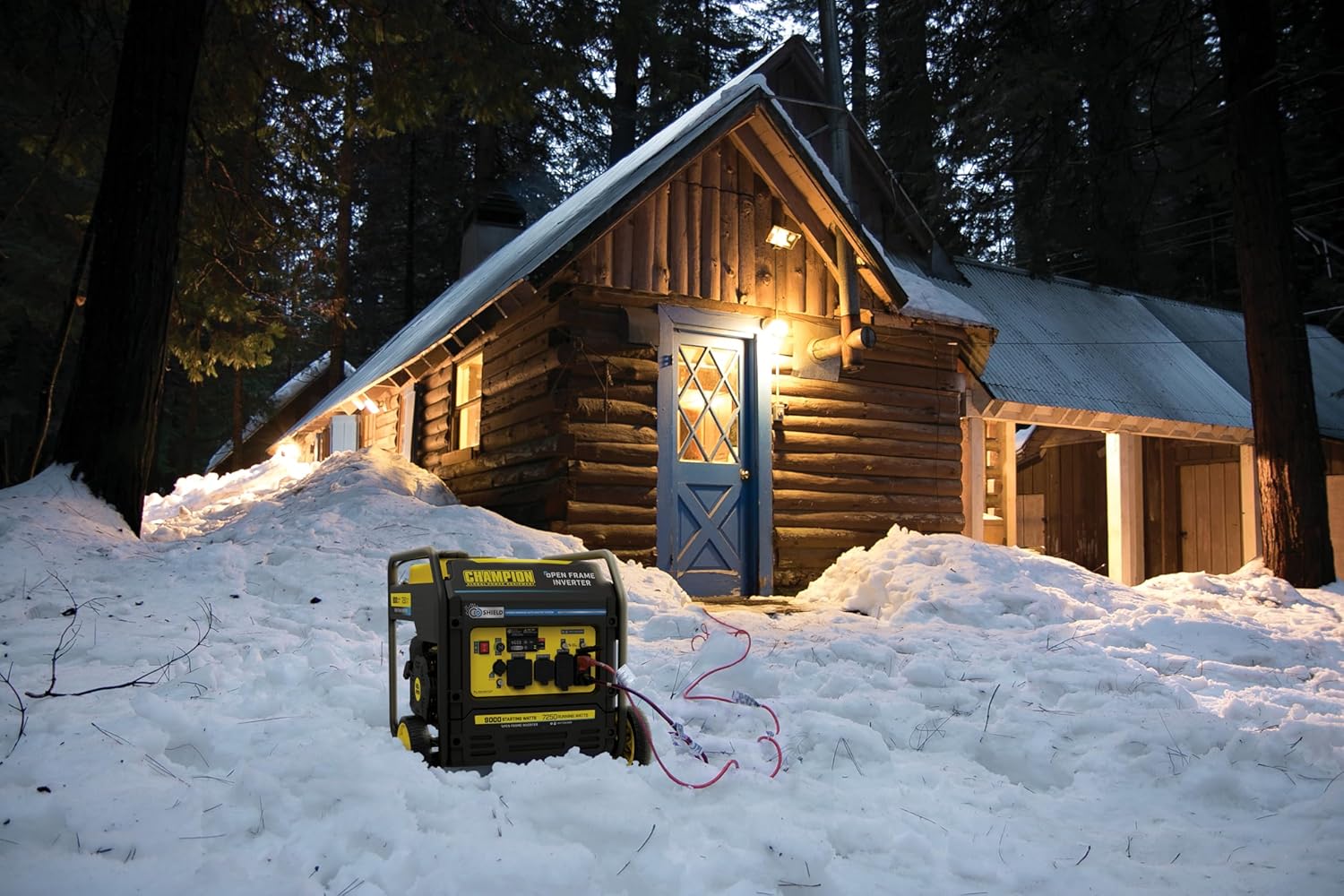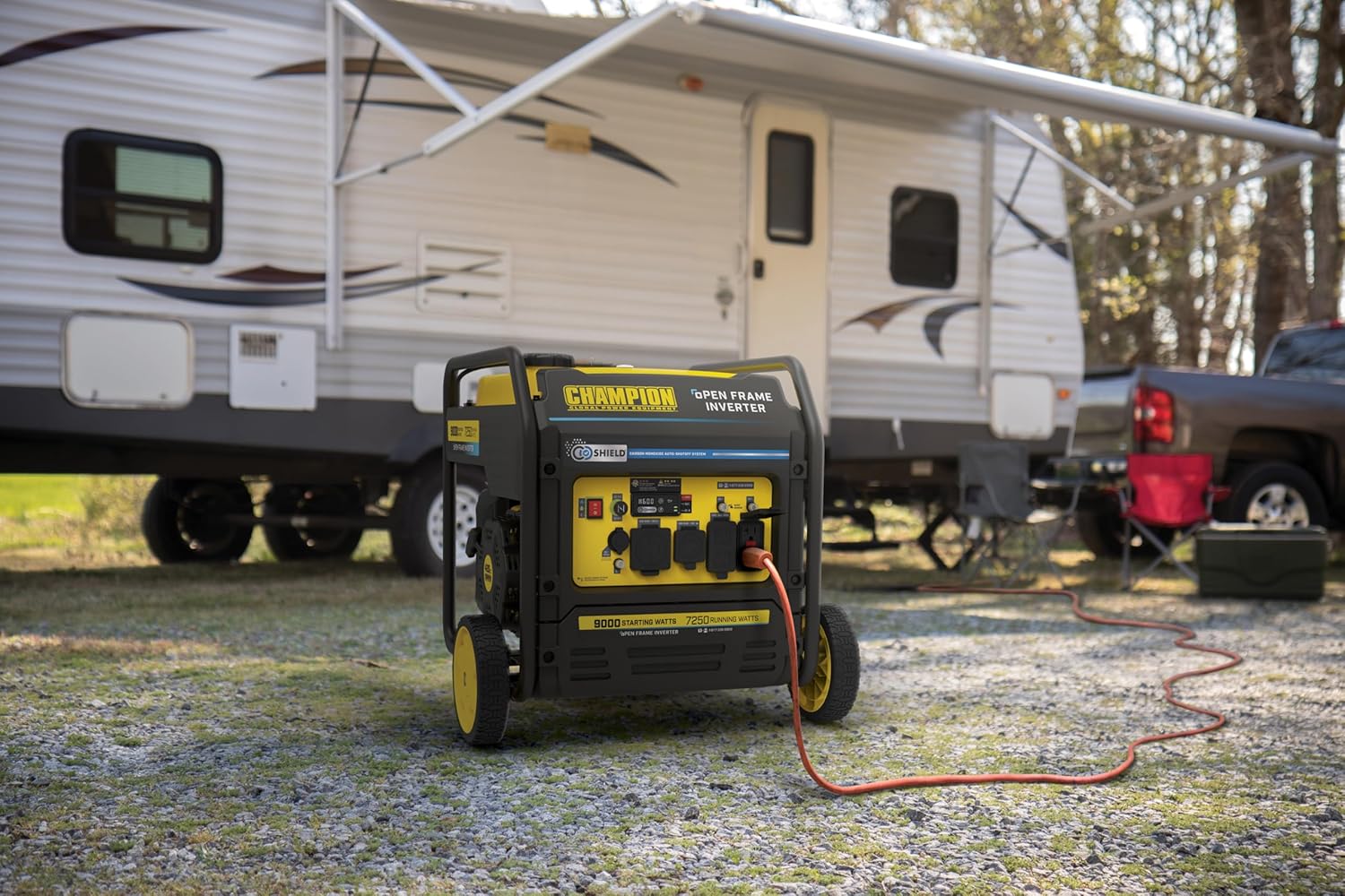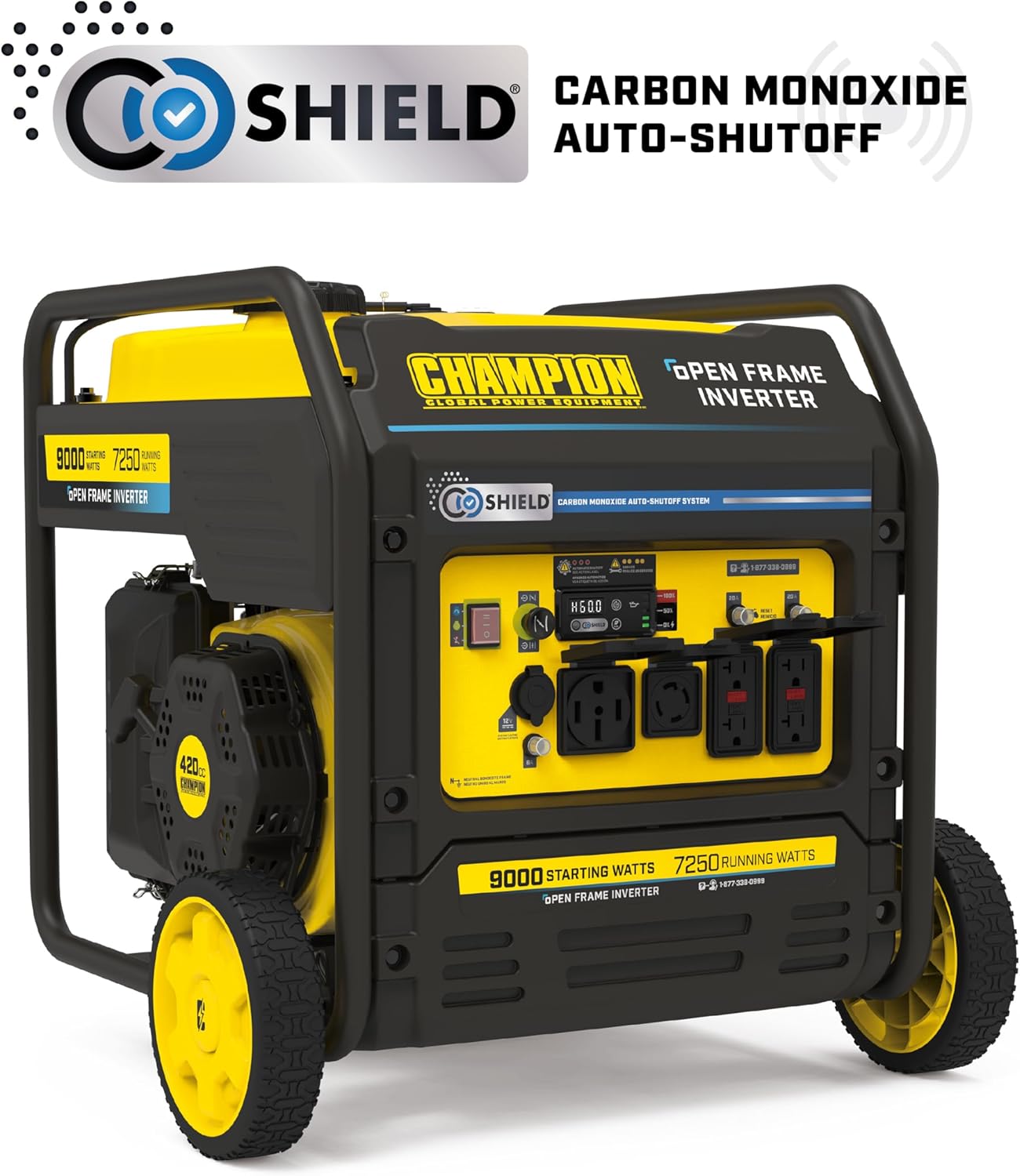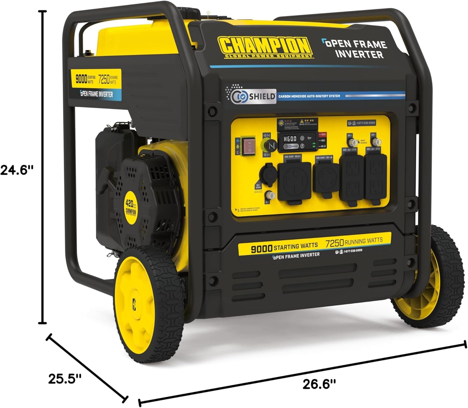 The Champion Power Equipment 9000-Watt Open Frame Inverter Generator with CO Shield® is one of the most innovative products on the market. Our advanced technology and innovative design will improve the way you power your life.First, we cut the noise level in half by integrating Quiet Technology digital components used in more advanced inverters. Then, we created an efficient mechanical design to decrease the overall footprint and weight by 20 percent. A quiet, lightweight addition to your RV and a cost-effective power solution, this Open Frame Inverter is smaller, quieter, lighter…BETTER!Champion’s got convenience covered. You’ll appreciate the handy electric start with included battery, plus Cold Start Technology ensures a quick start in cold weather. The reliable 420cc Champion engine produces 9000 starting watts and 7250 running watts, and runs for 10.5 hours at 25% load when the 4.3-gallon fuel tank is full.Confidently connect your sensitive electronics since this inverter produces Clean Power (less than 3% THD).Our Quick Touch Panel offers fast access to all your controls. The Intelligauge with Power Meter monitors voltage, frequency and operating hours with ease, while Economy Mode monitors power consumption in real time to reduce electrical load. As the electrical load is reduced, the engine idles lower, providing quieter operation, extended engine life and higher fuel economy.All the outlets have covers for protection and include two 120V 20A GFCI protected household duplex outlets (5-20R), a 120/240V 30A locking outlet (L14-30R), a 120/240V 30.2A outlet (14-50R), plus a 12V automotive-style outlet, and a handy dual port USB adapter you can use to power your phone, laptop, or similar device.Buy this fully assembled EPA certified and CARB compliant generator with confidence – Champion Support and our nationwide network of service centers will back up your purchase with a 3-year limited warranty and FREE lifetime technical support.CO Shield® technology monitors the accumulation of carbon monoxide (CO), a poisonous gas produced by engine exhaust when the generator is running. If CO Shield® detects unsafe elevated levels of CO gas, it automatically shuts off the engine. CO Shield® is not a substitute for an indoor carbon monoxide alarm or for safe operation. DO NOT allow engine exhaust fumes to enter a confined area through windows, doors, vents or other openings. Generators must ALWAYS be used outdoors, far away from occupied buildings with engine exhaust pointed away from people and buildings. Meets the requirements of ANSI/PGMA G300-2018.