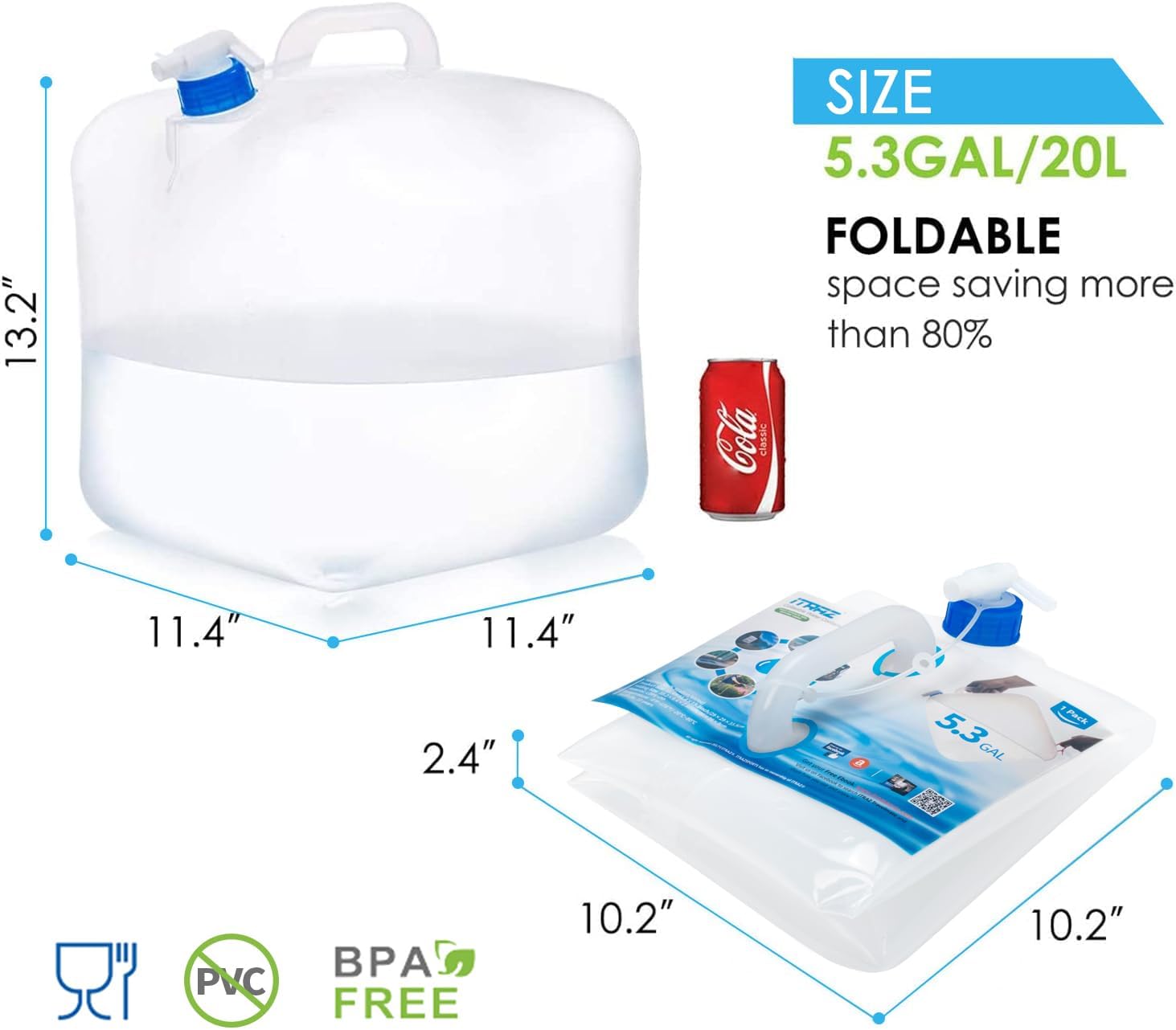 HIGHEST-QUALITY US RAW MATERIALS: The ITRAZ collapsible water container is made from a new type of LDPE4 and PP, which are environmentally friendly, food-grade, non-toxic, odorless, and free from BPA, PVC, and DHEP. This makes it safe for storing drinking water. It is more transparent, flexible, and softer than other brands on the market. Additionally, it is less likely to crack or become damaged and is durable enough for heavy-duty use.