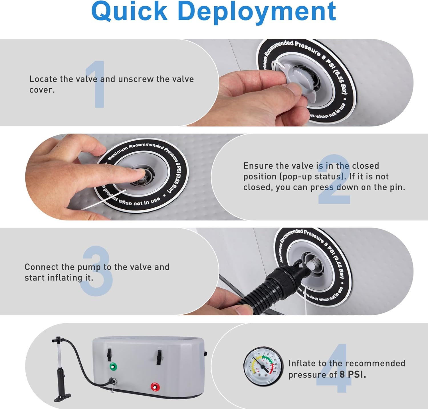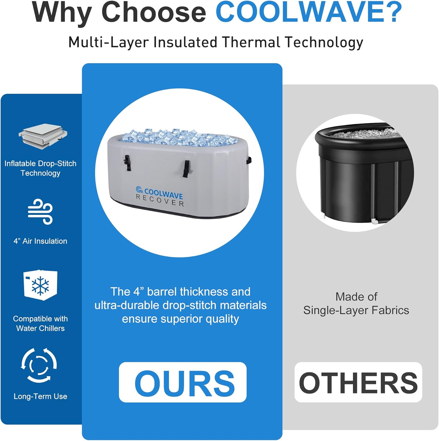 COOLWAVE Ice Bath Tub is constructed from high-quality, multi-layer PVC. Its inflatable drop-stitch technology enhances heat insulation, strength, and puncture resistance when fully inflated.