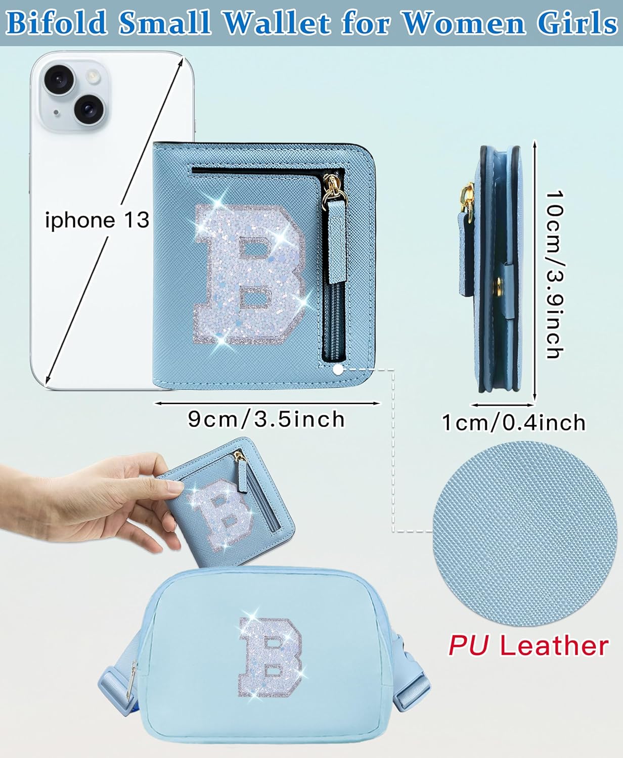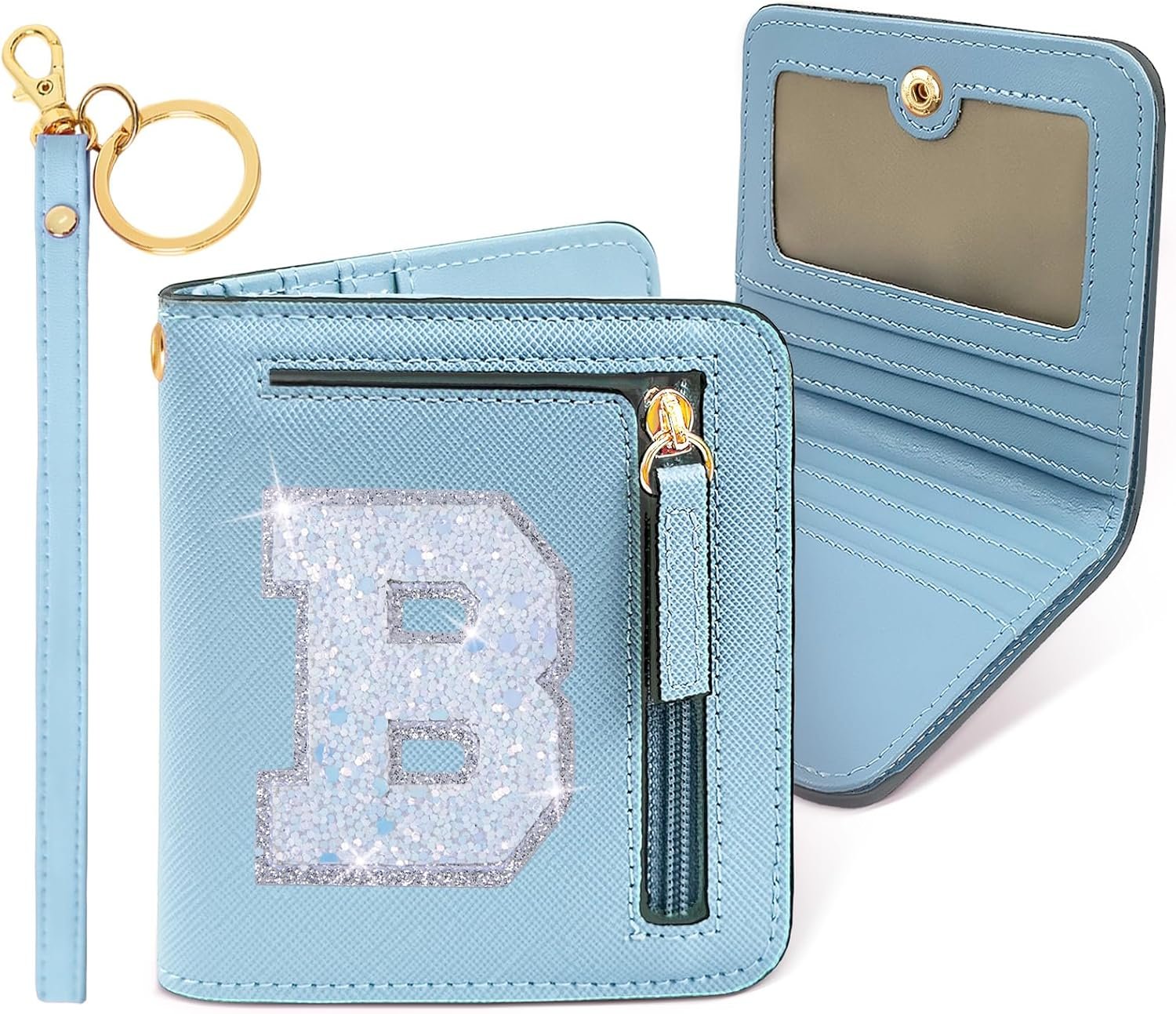 [Sparkly Letter Wallet Small Bifold for Women ladies Girls Initials] Blue girls wallet with monogram glitter letter patch, trending personalized gifts for 6 7 8 9 10 11 12 13 14 year old girls birthday Valentines Day Easter basket stuffers; Mothers day gifts for mom, Fathers day gifts for daughter, nurse day appreciation gift ideas, unique preteen tween teen girl gifts blue girly trendy stuff.