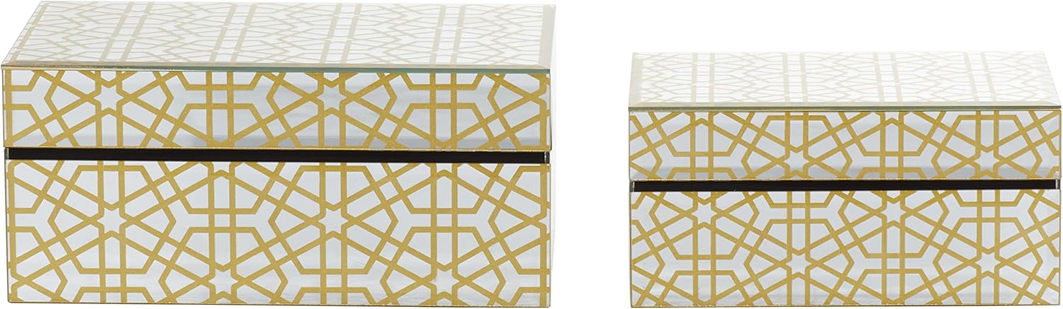 A great storage unit to display your decor and memorabilia in a compact friendly setting. Keep your belonging protected and secure in this beautifully designed jewelry box. Add a combination of form and function in your living room with this box set on your console table or bookshelf. This item ships in 1 carton. Designed with a wide enough space for small objects. Mdf box makes a great gift for any occasion. Suitable for indoor use only. This item ships fully assembled in one piece. This gold colored mdf jewelry organizer comes as a set of 2. Glam style.