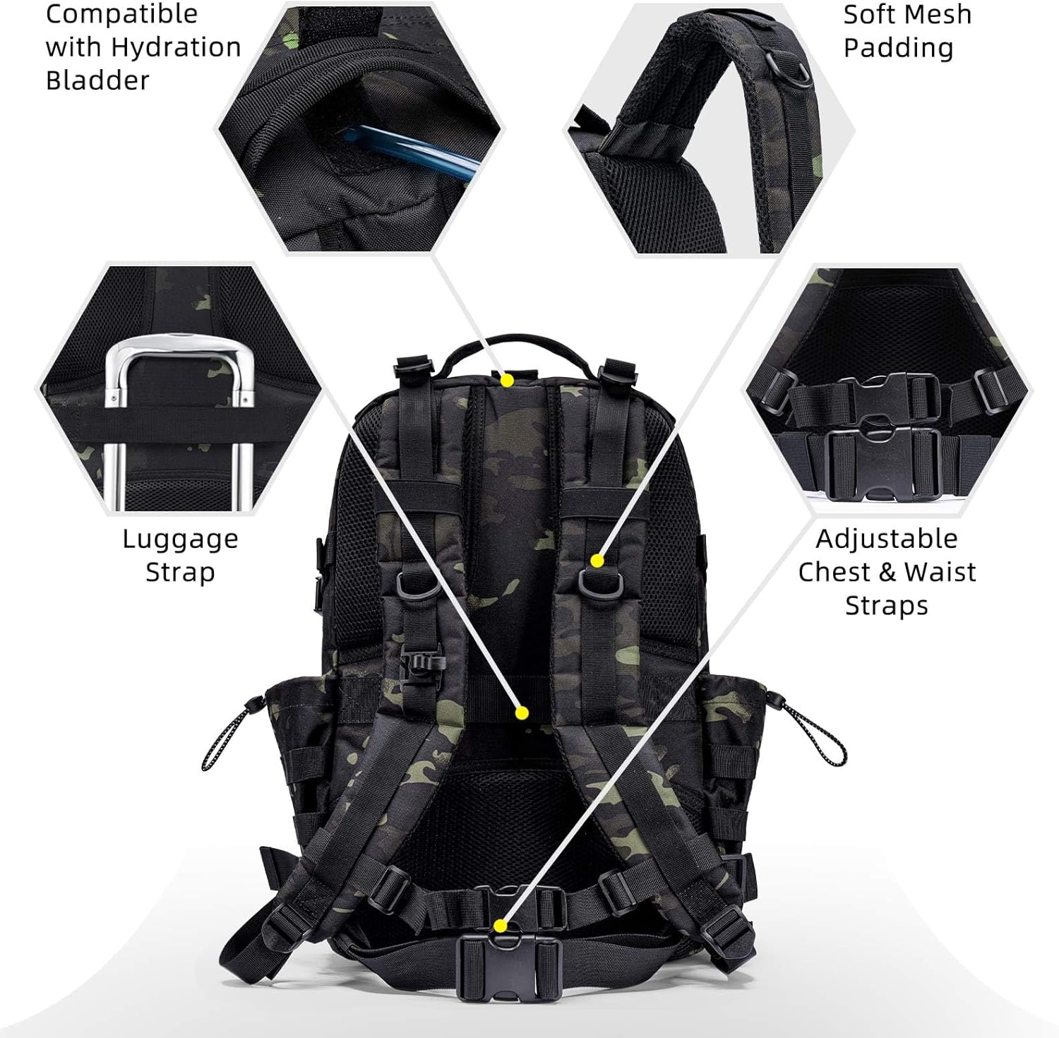 High-density Fabric and Good Protection – The Military army backpack is made of high-density fabric and double-stitched, heavy-duty zippers. The Tactical Molle backpack is water-resistant and wear-resistant, which is good for protecting your gear in rainy days and rough conditions. In addition, it is also compatible with a 3L water bladder well -The Product does not include the water bladder. These heavy-duty properties ensure your long-term use and perfect experience.