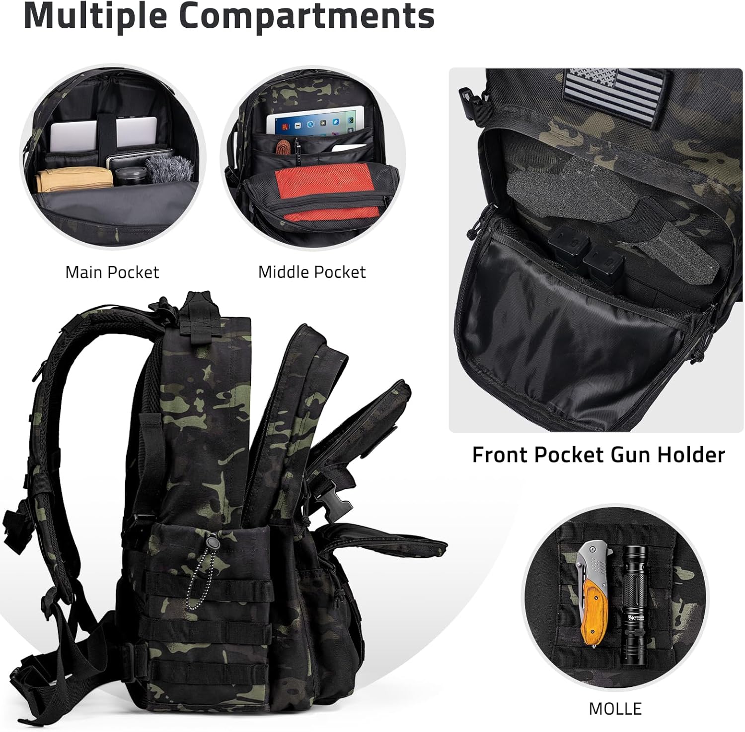 Multiple Compartments – Our hiking backpack has 8 compartments -3 main pockets with heavy duty zippers, 5 compartments in the pockets, help you separate items of different types, providing good organization. There are both waist straps and chest straps to keep the backpack from bouncing around when you are running. The assault backpack also designed straps on the sides and bottom of the pack which is convenient to attach a tent or sleeping pad to the backpack.