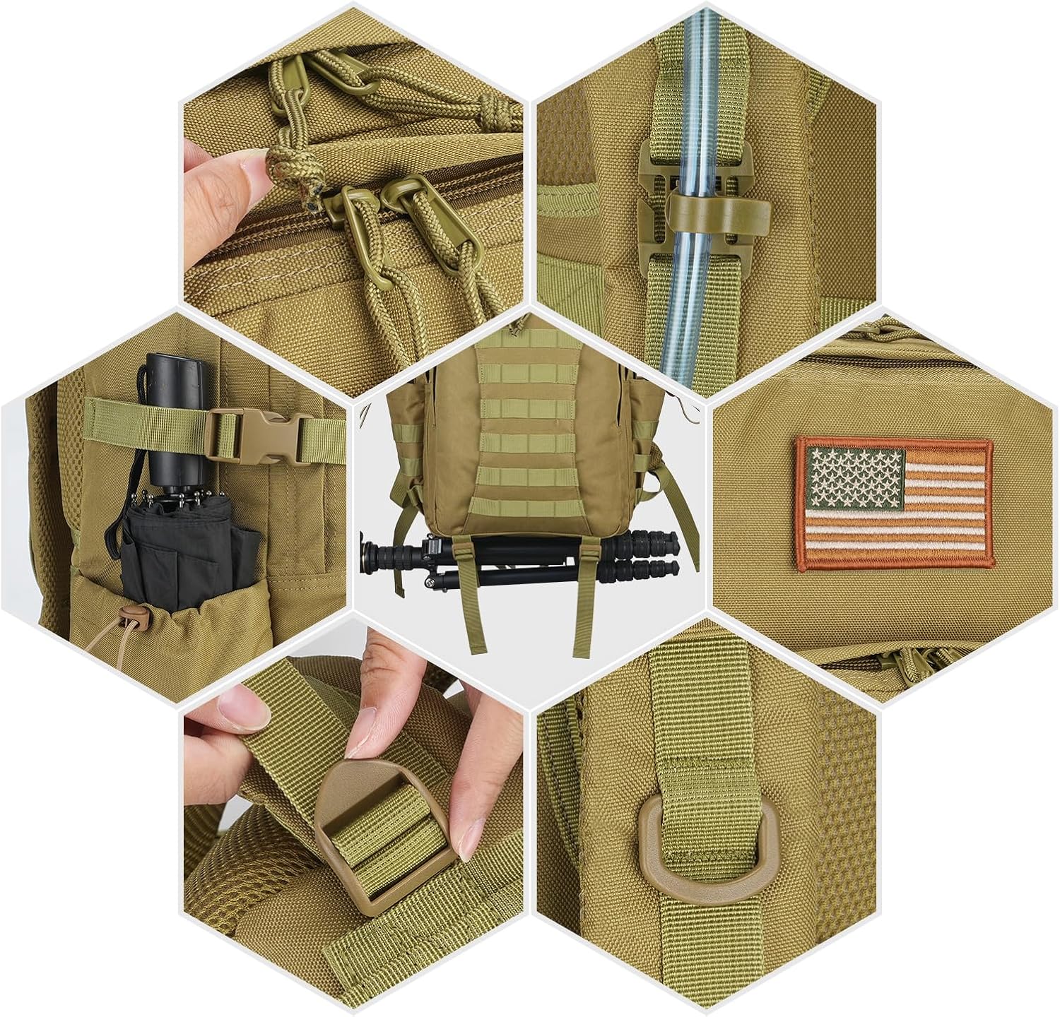 High-density Fabric and Good Protection – The Military army backpack is made of high-density fabric and double-stitched, heavy-duty zippers. The Tactical Molle backpack is water-resistant and wear-resistant, which is good for protecting your gear in rainy days and rough conditions. In addition, it is also compatible with a 3L water bladder well -The Product does not include the water bladder. These heavy-duty properties ensure your long-term use and perfect experience.