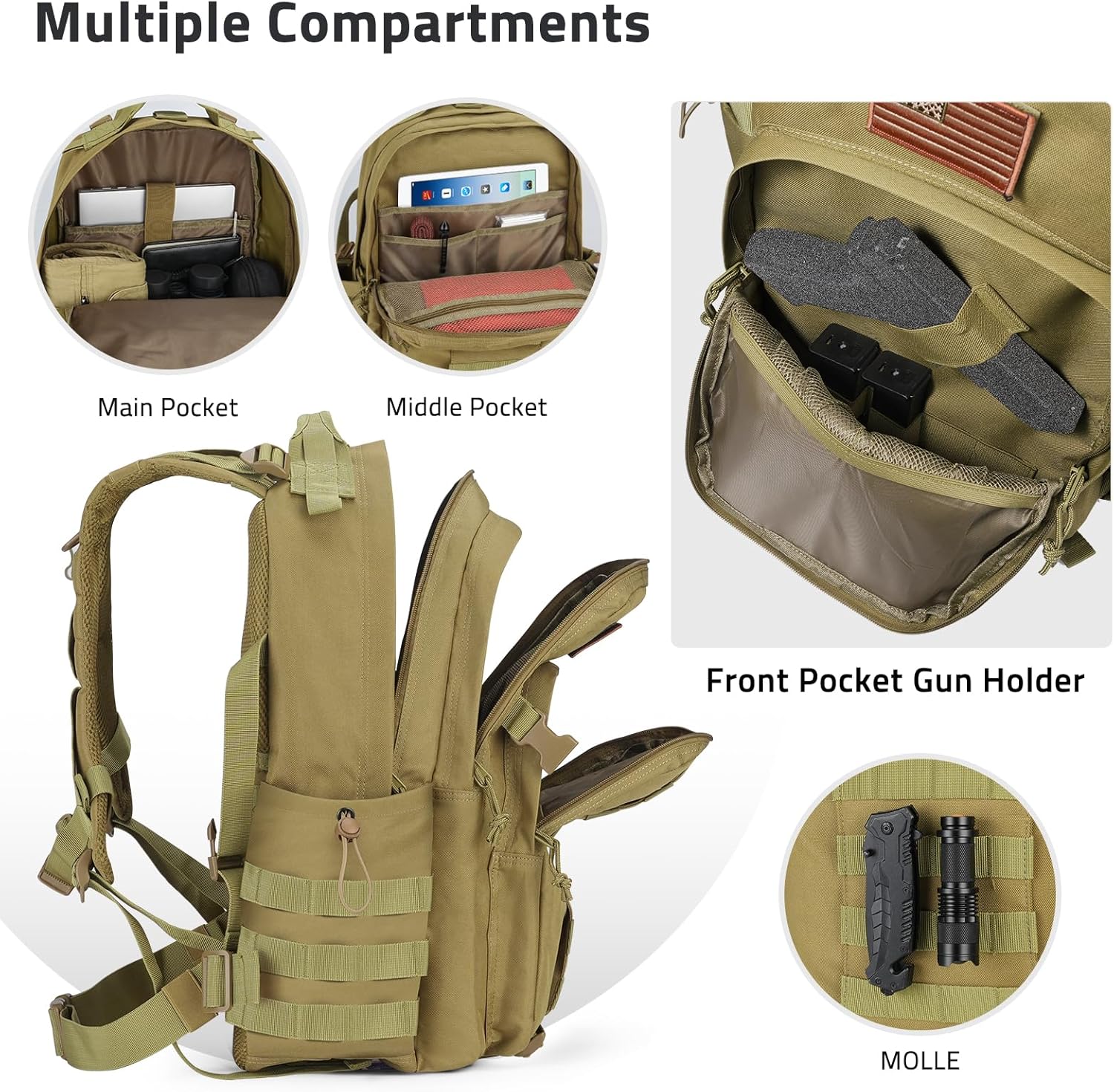 Multiple Compartments – Our hiking backpack has 8 compartments -3 main pockets with heavy duty zippers, 5 compartments in the pockets, help you separate items of different types, providing good organization. There are both waist straps and chest straps to keep the backpack from bouncing around when you are running. The assault backpack also designed straps on the sides and bottom of the pack which is convenient to attach a tent or sleeping pad to the backpack.