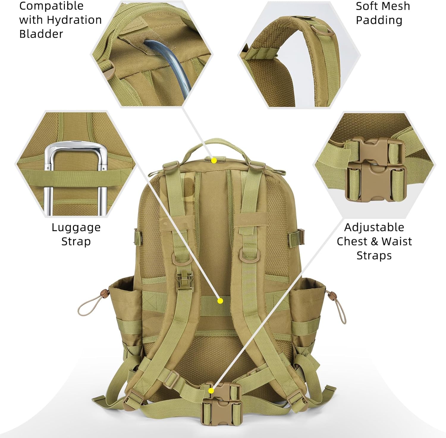 Large Capacity Tactical Backpack – Our large capacity military backpack size approx: 19″x12.5″x9.5″ dimensions and appropriately sized 40L capacity, allowing you to carry all the military essentials, it can be used as travel backpack, hunting backpack, gym backpack, survival backpack, combat backpack, outdoor backpack, trekking backpack.