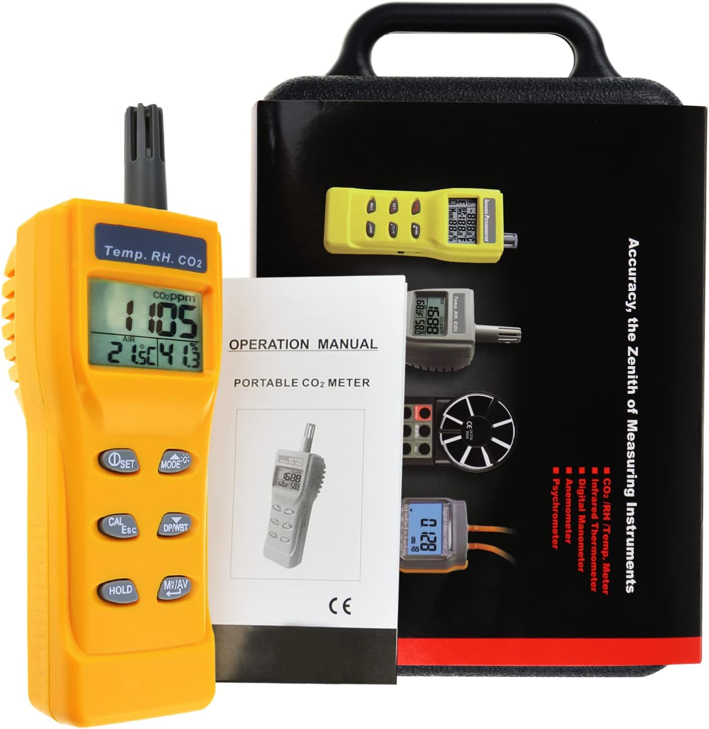 【Wide Mesurement Range】: CO2 monitor is designed with large measuring range.CO2: 0~9999ppm; Temperature:14°F-140°F(-10°C/+60°C); Humidity (0.1% – 99.9%RH); Dew Point: -20.0 – 59.9°C; Wet Bulb: -5.0 – 59.9°C
