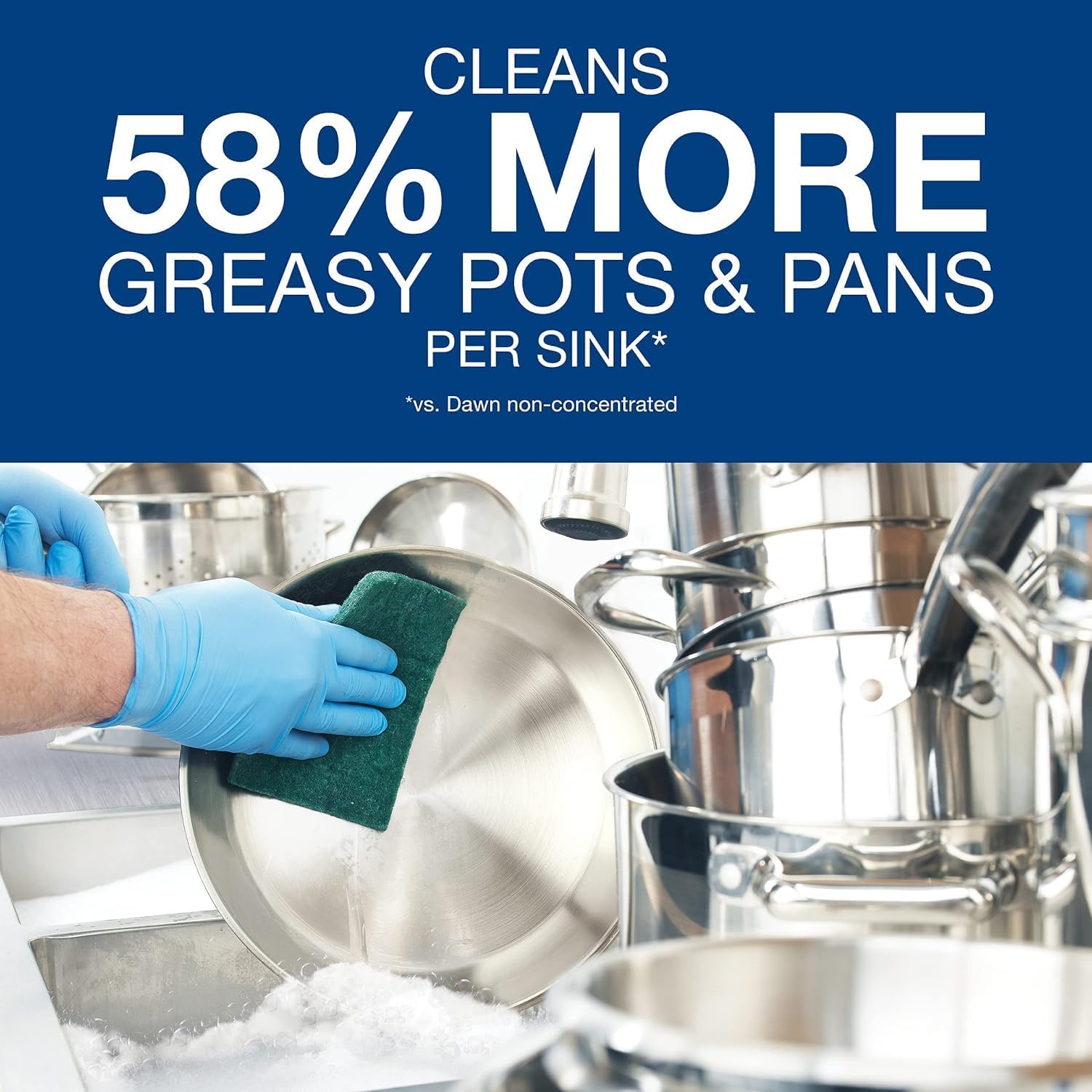 Dawn Professional dishwashing detergent with long-lasting suds cleans 58percent more greasy pots and pans per sink (vs. Dawn non-concentrated)