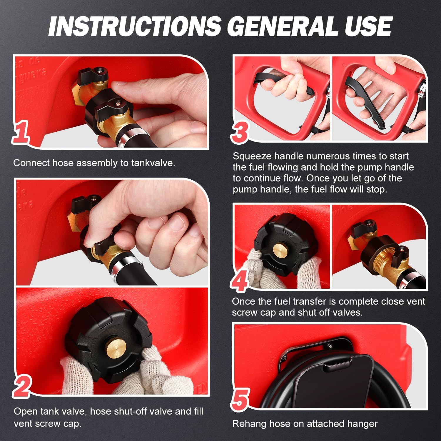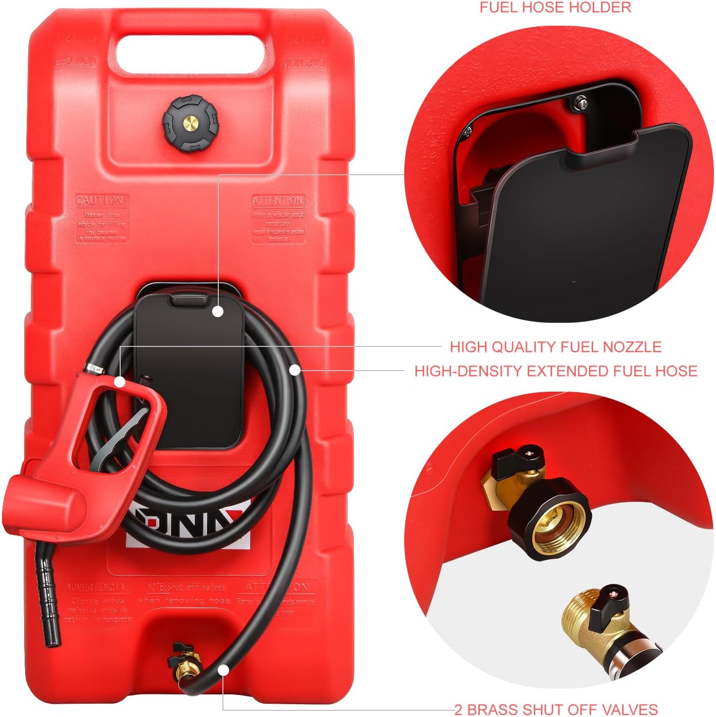 SAFE AND RELIABLE DESIGN – Features 2 brass shut off valves to ensure safe and easy hose disconnection. The fuel caddy comes equipped with a hose holder for easy storage.
