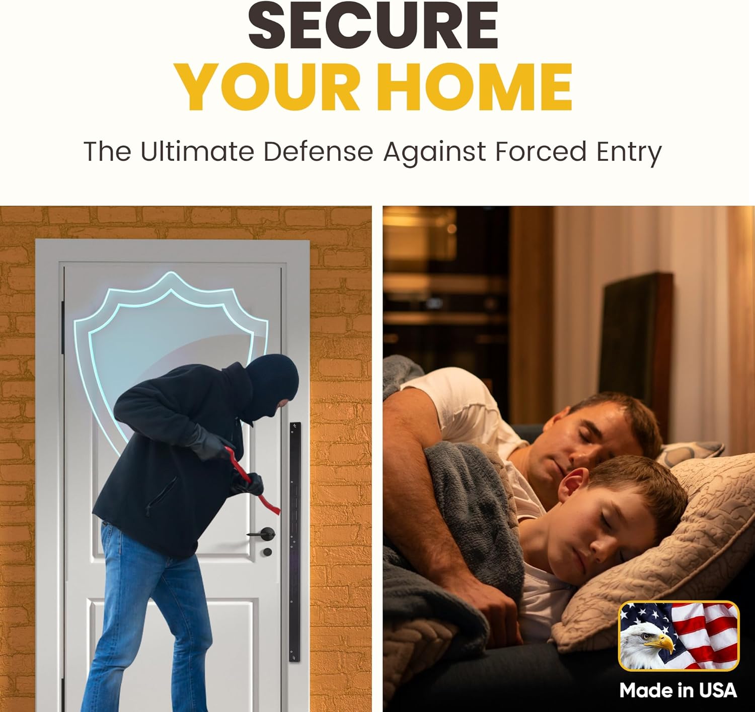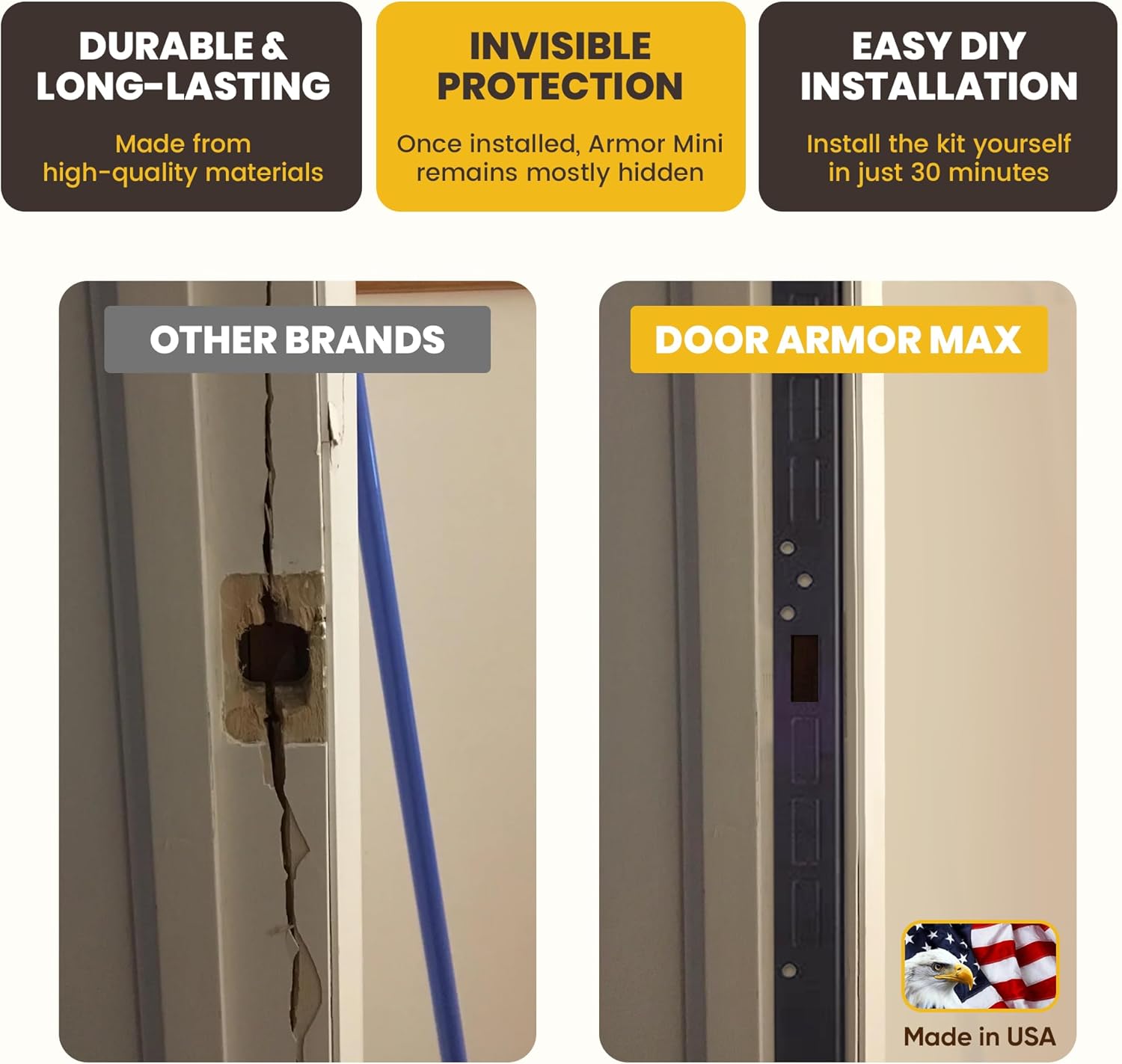 Protecting you and your family can rely on looking to deter burglars and those that want to harm your family and loved ones; Does the thought of an intruder breaking into your house keep you up at night?; Armor Concepts is the solution that will drive those concerns and worries right out the door; Nobody expects their apartment door security to be broken and you might think that it will never happen to you. but did you know that 66% of all burglaries are residential [home] break-ins and that homes without some type of protection are over 300 times more likely to experience a break in? That’s why it’s always recommended that you install some form of home security, and using armor concepts’ door armor mini makes the perfect first line of defense against would-be intruders. Studies show thieves prefer easy access through unlocked doors or windows. When they can’t easily force their way in, they retreat and more often than not, never bother that home again. With armor concept’s door armor mini, you’re taking the first step in making your home safer and more secure for the people and valuables that you care about; Looking for more reasons to choose the door armor mini? A simple and effective way to keep your property and family safe in about 20 minutes. affordable and reliable home protection you can count on. Constructed with high-grade steel to make even the filmiest of doors secure. Proven to be stronger than competitor door reinforcement kits.