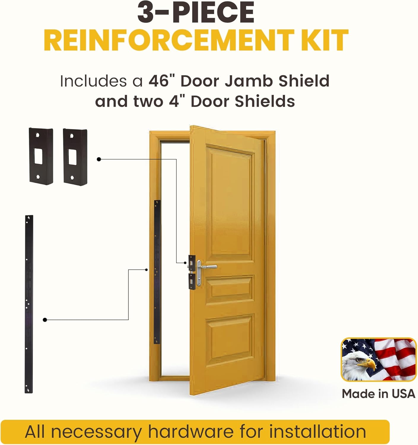 THE DOOR ARMOR JAMB SHIELD IS 46″ LONG: The Door Jamb can be protected with this shield, it is cut with knock-out holes that are designed to fit locks spaced from 4.5″ to 21.5″ apart, (1) is Included in every Door Armor door lock reinforcement Kit