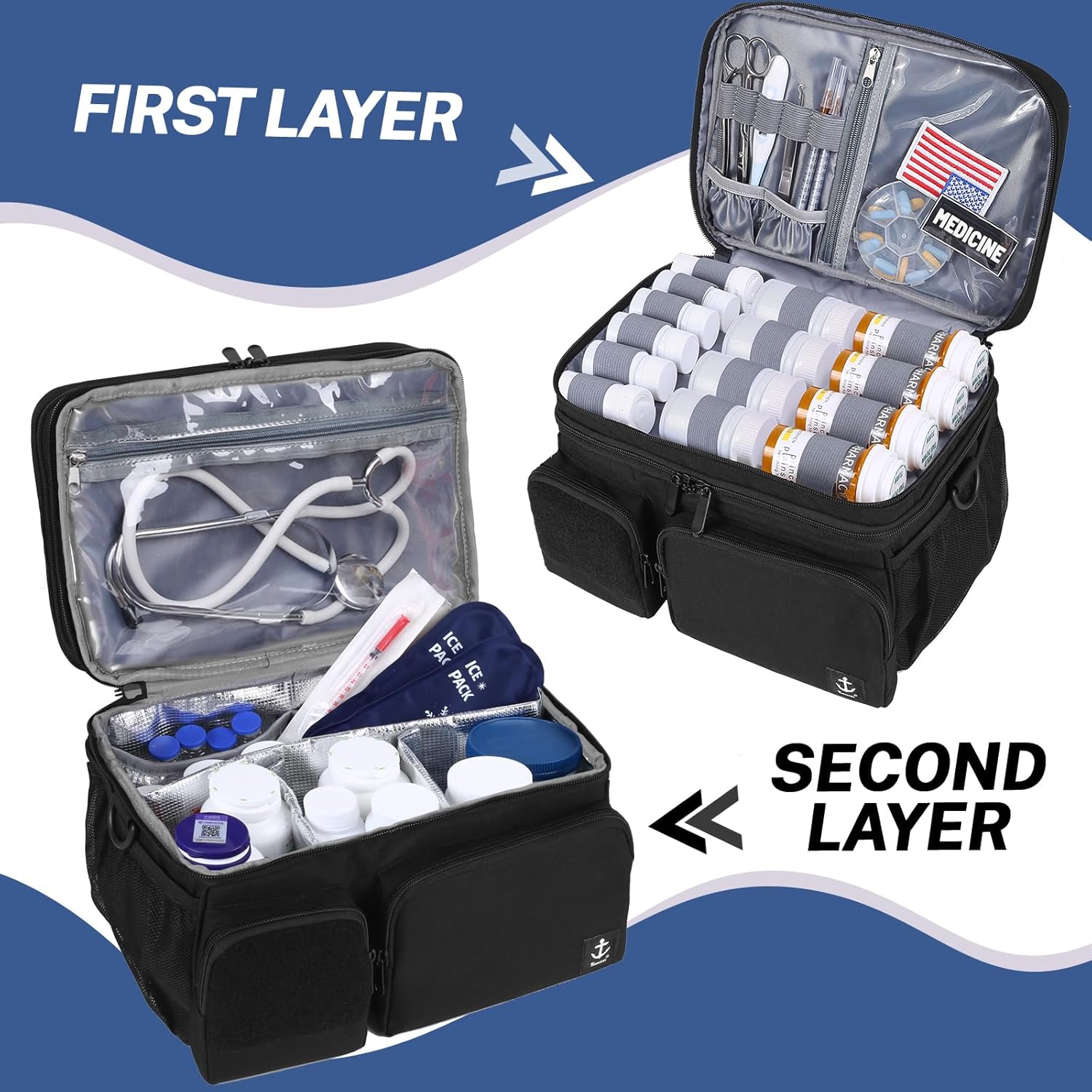 【Large capacity and double-layer design】External dimensions:12”*8”*8.3” With its double-layer design, this large medicine bag offers ample space to store and organize all your medications, pill bottles, and medical supplies.