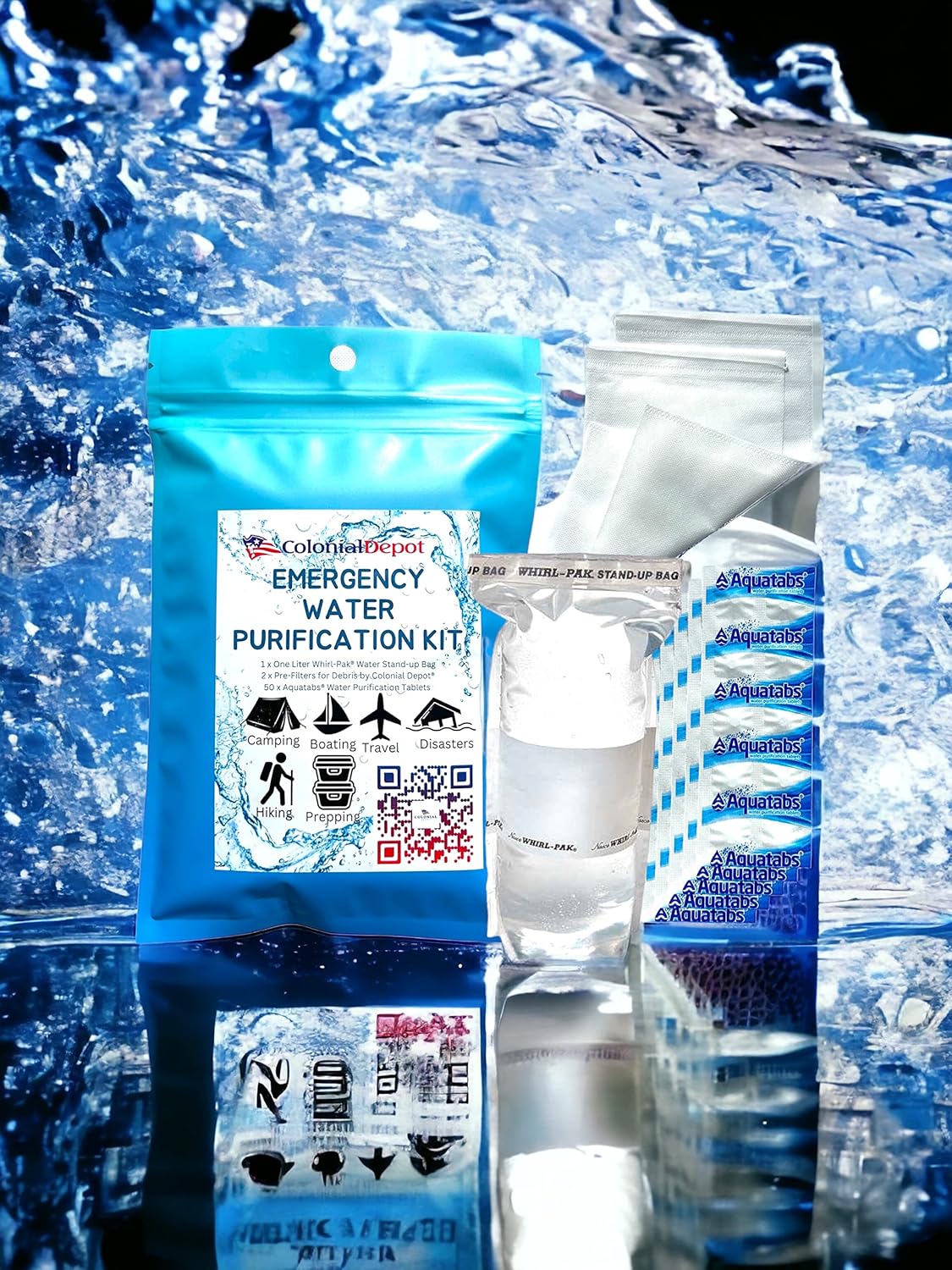Gear Up For Your Outdoor Backpacking Adventures And Be Prepared For Emergencies With The Ultimate Portable Kit For Purifying WaterDesigned For Camping, Hiking, Trekking, Rowing, Survivalists, International Travel, Disasters, And Those Who Prioritize Emergency Disaster Preparedness, This Comprehensive Kit Provides You With The Essential Tools To Purify Water In Challenging Environments. The Purifying Tablets Eliminate Harmful Contaminants And Microorganisms, Transforming Even The Most Questionable Water Sources Into Potable And Refreshing Water. 99.9999% Reduction in bacteria, 99.99% reduction in viruses, 99,9% reduction in giardia cysts.With This Kit As Part Of Your Bug-out Bag, Prepping Gear, Camping Pack, You Can Trust That Your Water Needs Are Covered When It Matters Most.Camping Must Haves, Compact And Lightweight, This Kit Is Designed For Portability. It Easily Fits Into Your Survival Gear, Bug-out Bag, Or Emergency prepper Supplies, Hiking Backpack, Making It An Essential Tool For Your Preparedness Efforts, You Can Navigate Through Challenging Situations With The Confidence That You’ll Have A Reliable Source Of Purified Water.Available in single kits (50 Aquatabs, 2 filters, 1 water bag), 4 pack kits (200 Aquatabs, 8 filters, 4 water bags), and 10 pack kits (500 Aquatabs, 20 filters, 10 water bags)
