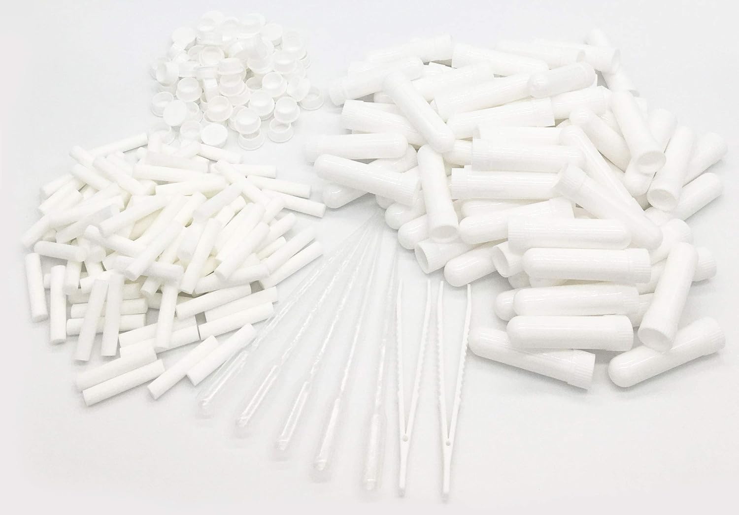 100 plastic nasal inhalers (Including 110 unscented wicks, 100 inhalers) and five 3ml polyethylene graduated pipettes included for easy transfer of oils.