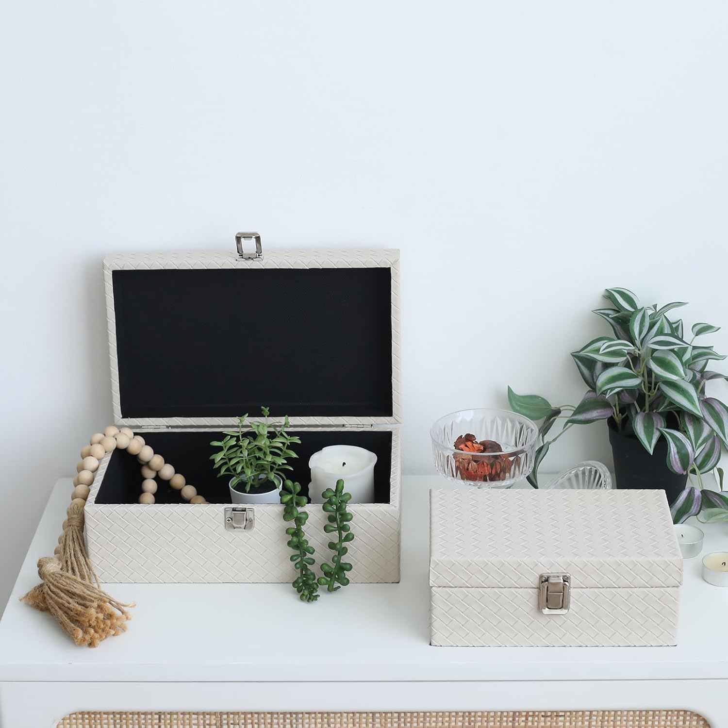 KEEP YOUR TREASURES SECURE – IN STYLE. – The lid with metal clasp keeps all your prized possessions safe and secure. The woven PU leather exterior adds an extra touch of sophistication. No matter what you need to store, this versatile boxes will ensure that all your items are kept safe and sound.